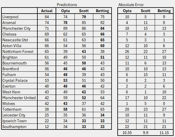 I forecasted Arsenal would score 87 goals while conceding 25. The actual numbers? They netted 69 (not nice this time) goals and conceded 34. My prediction would have been a +67 goal difference on par with an incredible league season but instead it was just a good +35 this season.