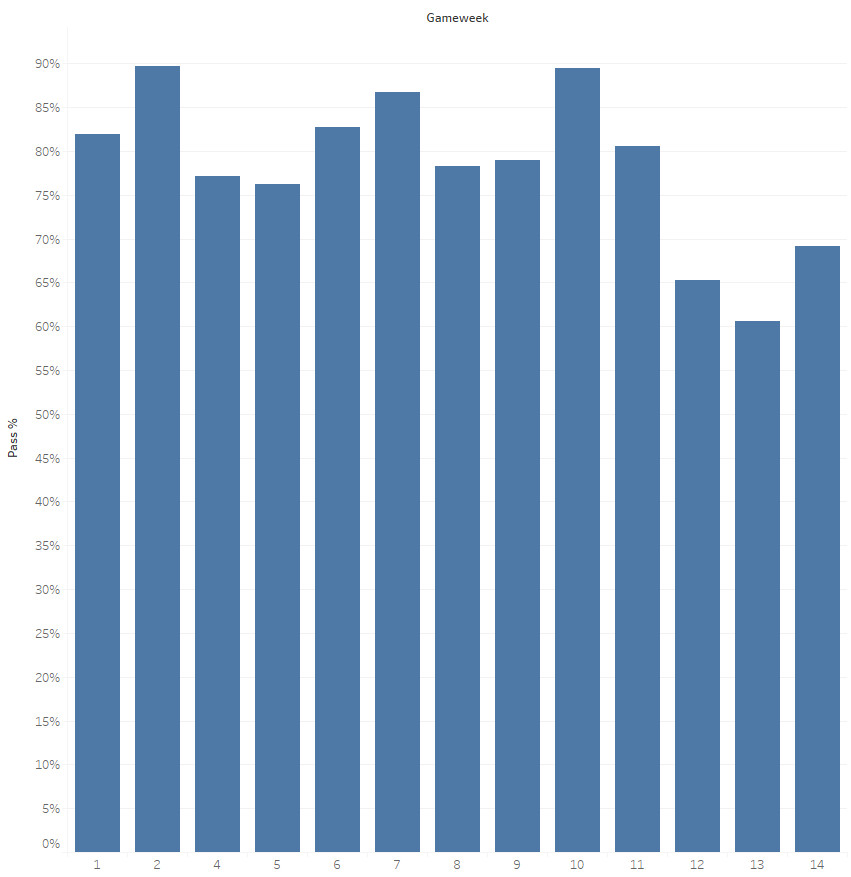 .The overall trend this season for his passing value added has been slightly downward, which is mostly in line with his pass completion percentage. A lot of this negative trend is driven by his atrocious first half against Burnley, where he completed just 56% of his passes and racked up a -0.2 PPVA, although he bounced back somewhat in the the second half with a 65% completion percentage and 0.05 PPVA.