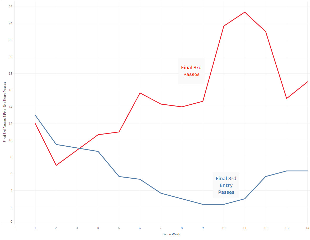 This is a big difference, because passes within the final third are much more difficult to complete (league average completion rate is 61%). When those difficult final third passes are completed, though, it is a really good thing for your team.
