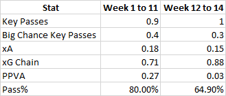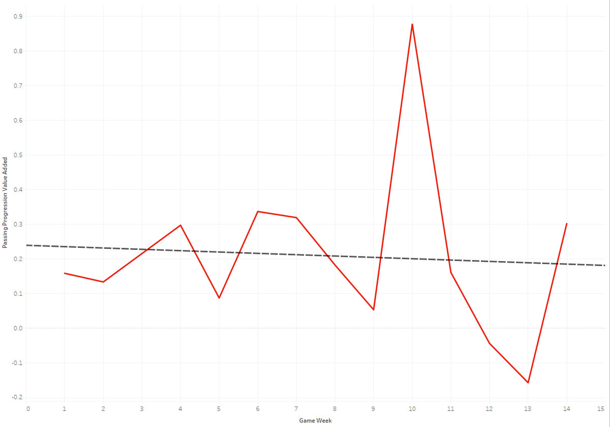 Looking at those numbers above, the only output to really have dropped along with the passing percentage is his passing value added stat. Even that is a bit deceptive, though, with two negative games followed by a very good passing value added match against Huddersfield Town.
