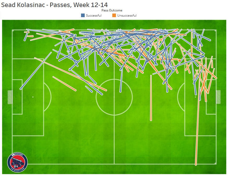 Kolašinac’s passing over the last three weeks, however, has taken a pretty significant dip. Over the first 11 weeks he passed at an 80.0% rate. Over those first 10 games played his completion percentage was fairly stable in the high 70’s to just below 90 percent but over the last three weeks his passing rate has dropped to an average of 64.9%