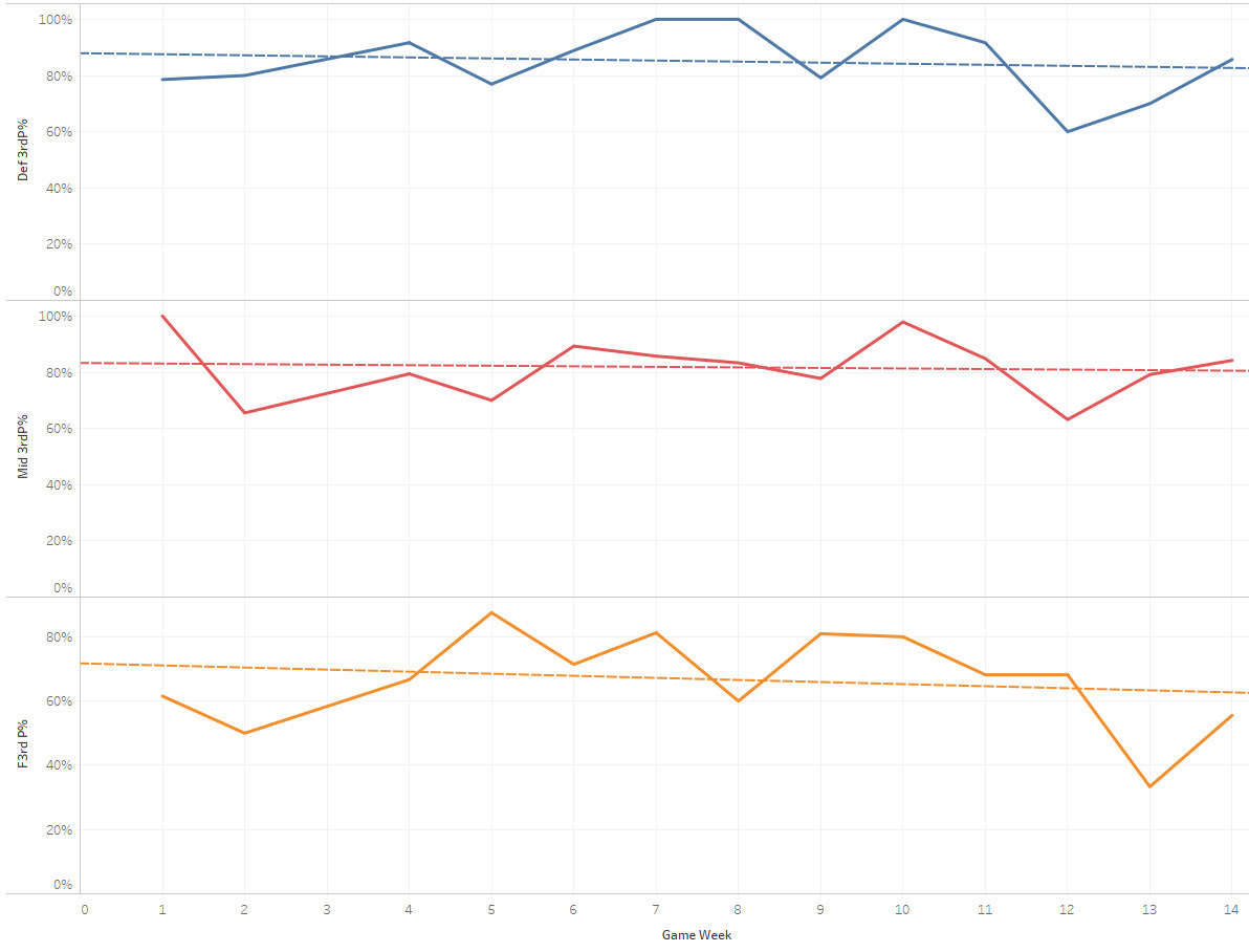 Just by the eye test, it looks like there are a good amount of completions (blue lines) in the defensive and middle thirds, but quite a few less in the final third. Looking at his completion percentage by zone over the season bears this observation out as well.