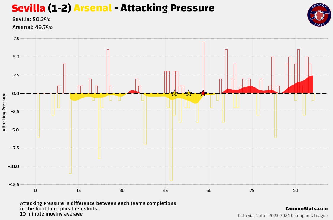 Sevilla started to apply pressure and Arsenal struggled to play out, they had just 5 sequences with 5 or more passes and just 3 with 7 or more passes. Sevilla started pressing effectively (9.4 PPDA in the last period) and forced Arsenal into mistakes (Arsenal completed significantly fewer passes than expected in their own half).