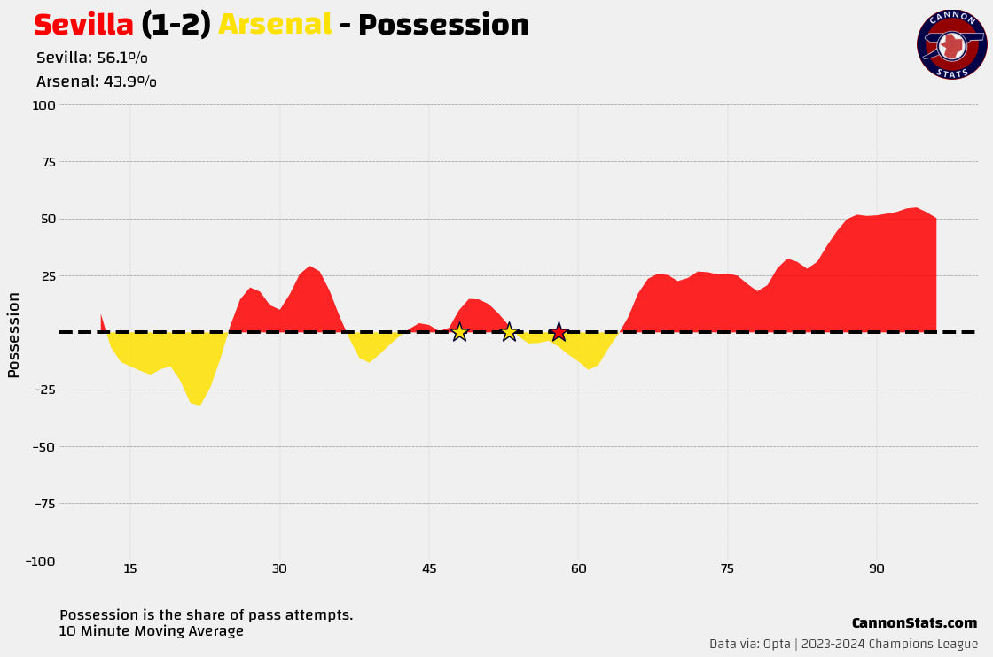 The possession had been close all game but started to shift towards the hosts, especially after they got a goal back. Arsenal struggled to get a hold of the ball consistently in the match, but that was exacerbated after the second goal.