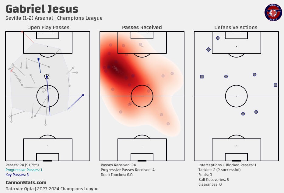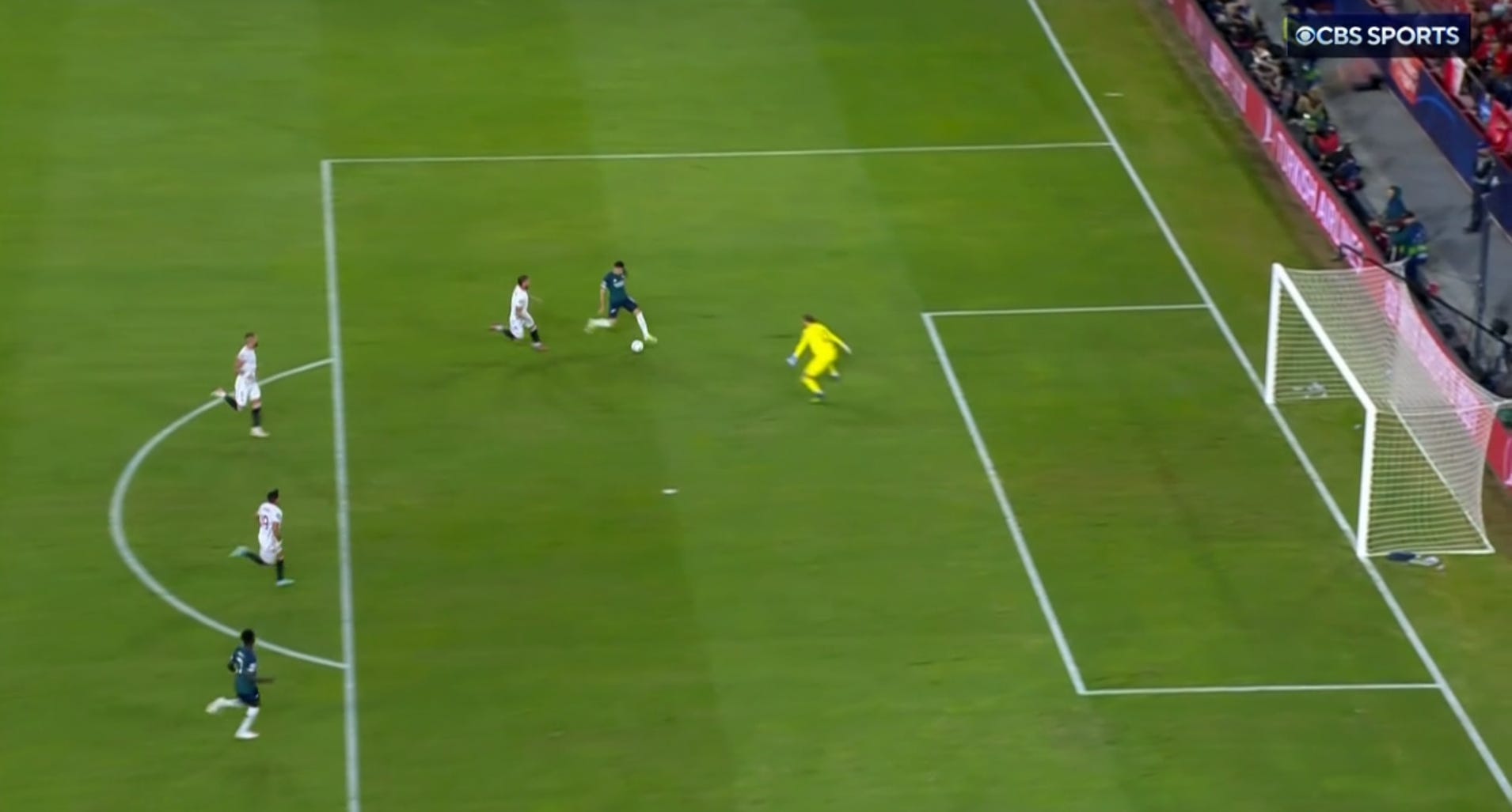 This was a warning sign for Sevilla, and they did not heed it because it happened again right before halftime, and this time Martinelli rounds the keeper and puts Arsenal a goal to the good.