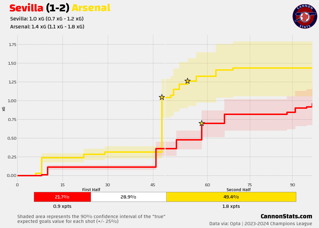 The win here moves Arsenal clearly into the driver’s seat for the group. The latest betting odds now have Arsenal 85% to win the group, which is up from 60% at the start. Taking care of business in the last two home matches would then guarantee things for Arsenal.
