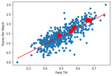 On a longer horizon looking at multiple matches, field tilt is a strong indicator that is associated with earning more points per match. This can help indicate if a team is doing something different than other teams that earn similar points, but again on its own it probably doesn’t tell you if it is good or bad.