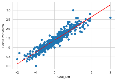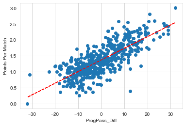 Progressive pass difference is another metric that shows a positive correlation but it is less strongly associated with points than field tilt! (0.76 r2).