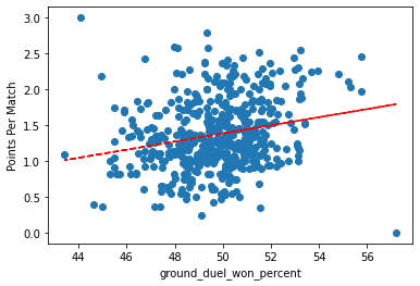 How often a team wins their duels is not heavily associated with winning. This is an interesting finding and one that goes a bit against the cliches about the team that wins their duels and wants it more win more often. It does have a positive relationship but it is not very strong (0.22 r2).