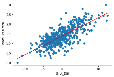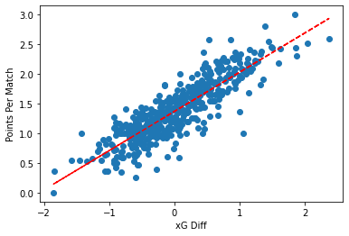 This is a very strong one and it makes sense because this is a direct measure of the chance quality in a match and that would be expected to correlate strongly with results (0.87 r2).