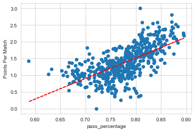Pass completion is a metric that I think is also associated with team quality but it is much more dependent on team tactics and that makes it more variable as a metric for predicting how often a team earns points (0.64 r2).
