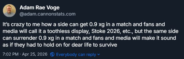 As I said, like everyone else I will never prefer a one-goal win, particularly in the moment. But another thing worth thinking about - particularly as we enter an age of Premier League talent compression and the potential further reduction of overall goal production, especially from open play - is what under siege really looks like, versus closing out a mostly uneventful one-goal win.