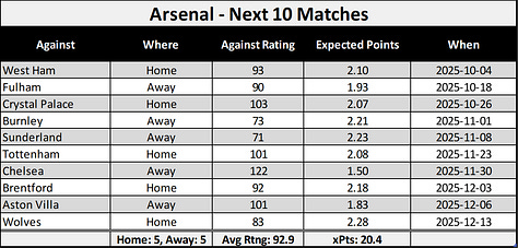 Arsenal’s Next five is West Ham (H), Fulham (A), Crystal Palace (H), Burnley (A), and Sunderland (A) before the November international break. There are no easy matches in the Premier League, but this might be the least challenging overall.