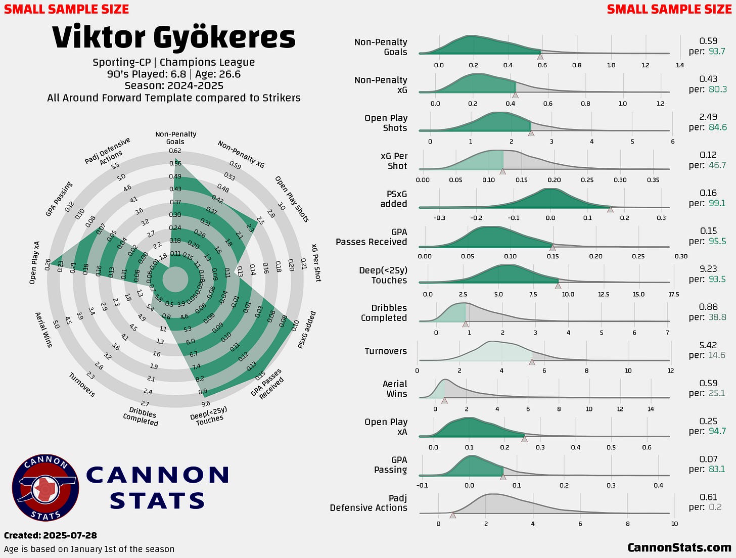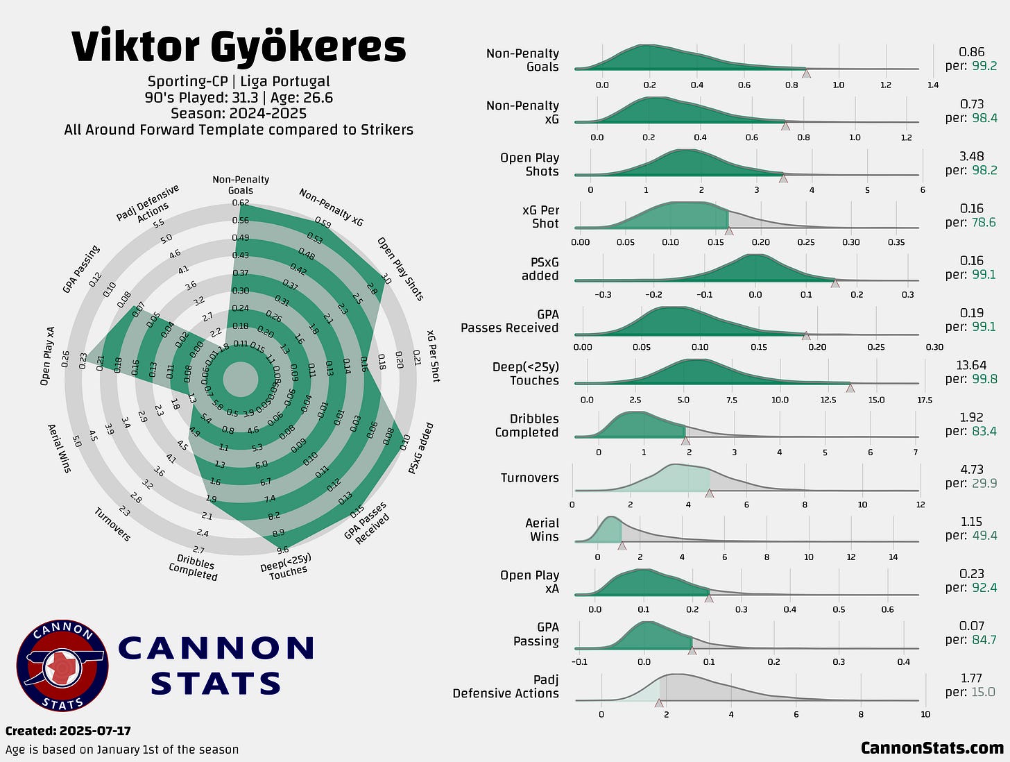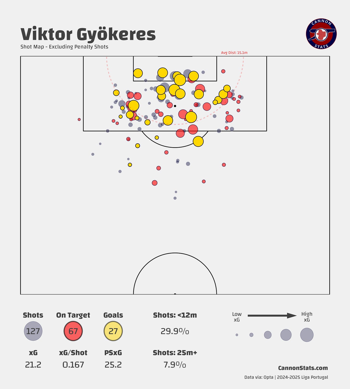 If there is one trait above all others that you want from a striker, it is that he gets lots of shots in good locations. Gyokeres is a guy that for his career that has generated shot volume and especially shot volume inside of the box. There are just few players that have reliably shot more than him over the last few seasons and even fewer that have done it with the same average chance quality and shooting locations.