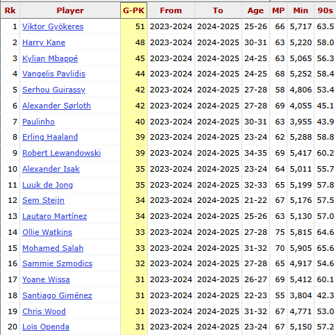 The most recent high-profile transfer from Portugal to England is Darwin Nunez from Benfica to Liverpool. He also put up video game numbers in his final season before moving (actually scoring non-penalty goals at a higher rate than Gyokeres) but has been a bit of a disappointment on Merseyside (they would love to move him this summer).