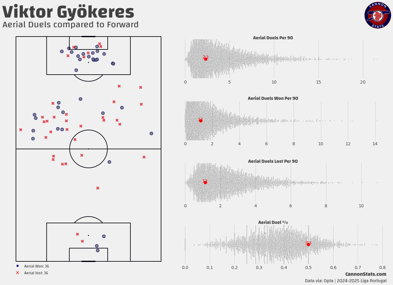 For a player that has his athletic traits and size (6-1½) Gyokeres is poor in the air. With Sporting he hasn’t been a target for a lot of balls that he needs to challenge for really seems to only go in for them when he has a good chance of winning them. He is not the type of striker that wants the long ball to him but rather the long ball into space.