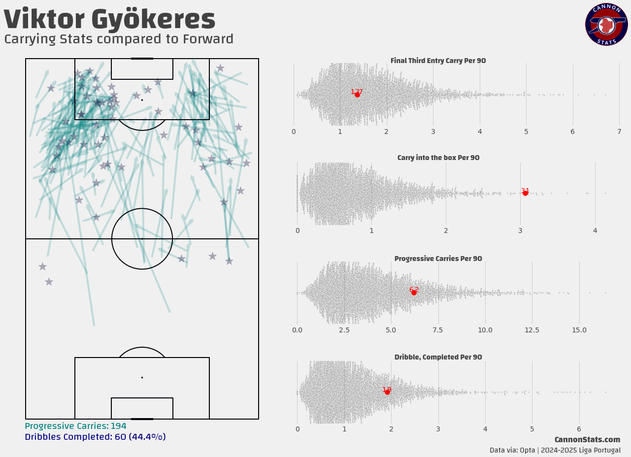 One of the traits that really jumps out with Gyokeres in addition to shooting is that he loves to drive with the ball at his feet. This is something that both attackers Arsenal have brought in this summer share. Gyokeres architype carry is receiving in the left channel and being able to drive into the box, he does this over and over and will hunt the ability to get enough space to get a shot off.
