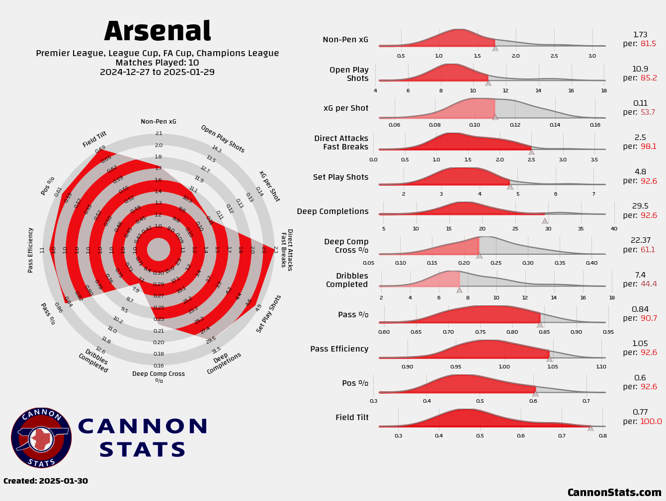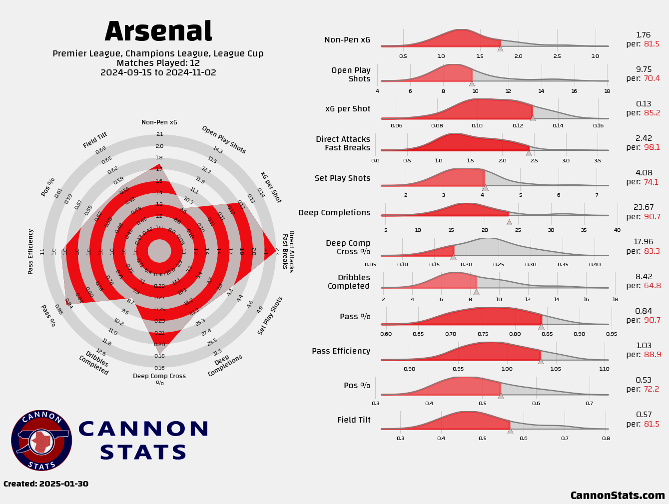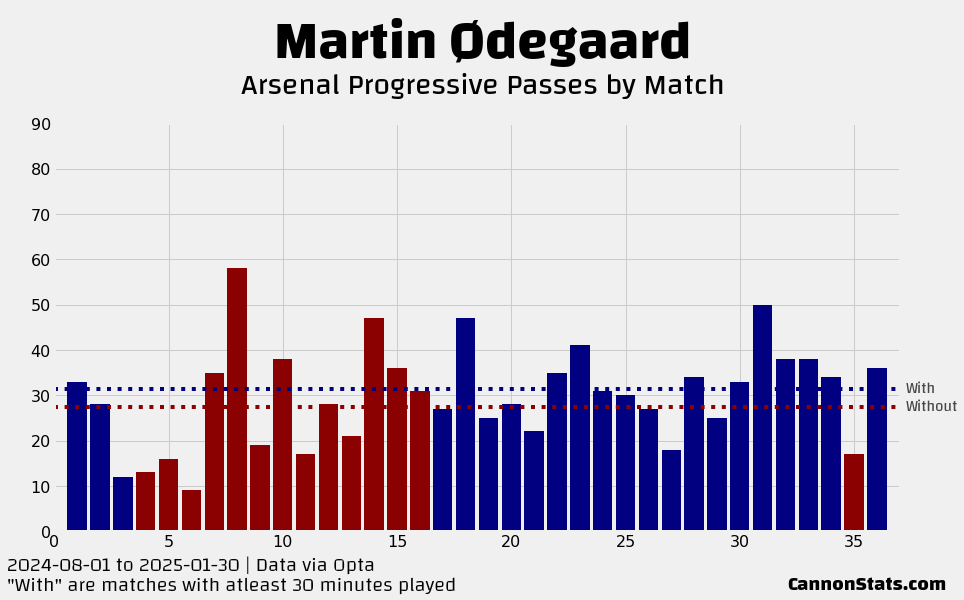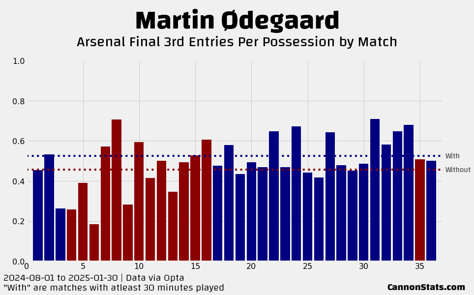 The big effect without Odegaard has been in the ball progression. Without him in the team the numbers for final third entries and progressive passes have taken a massive hit, these are items that Odegaard has come to be depended upon and really shouldn’t be a surprise.