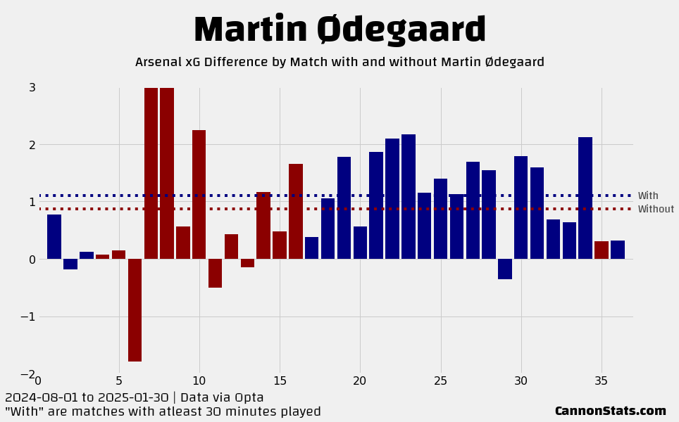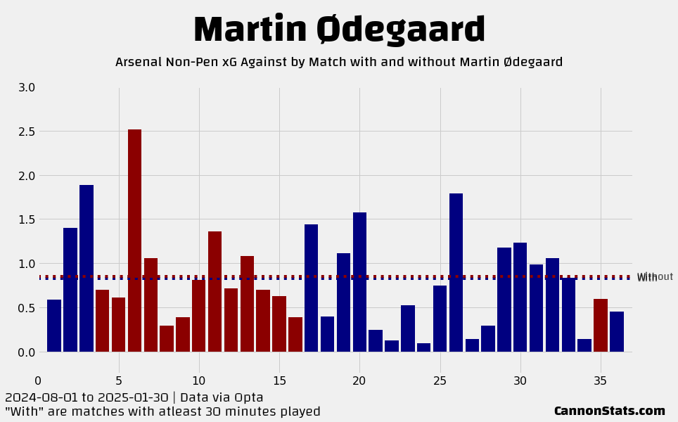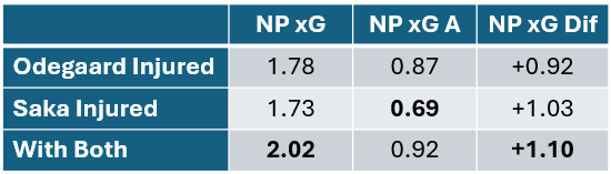There is a drop with both of them out of the team but it is slightly larger with Odegaard out. This also includes Arsenal’s worst statistical match of the season (Manchester City away) that is heavily effected by a red card so without that it is much closer.
