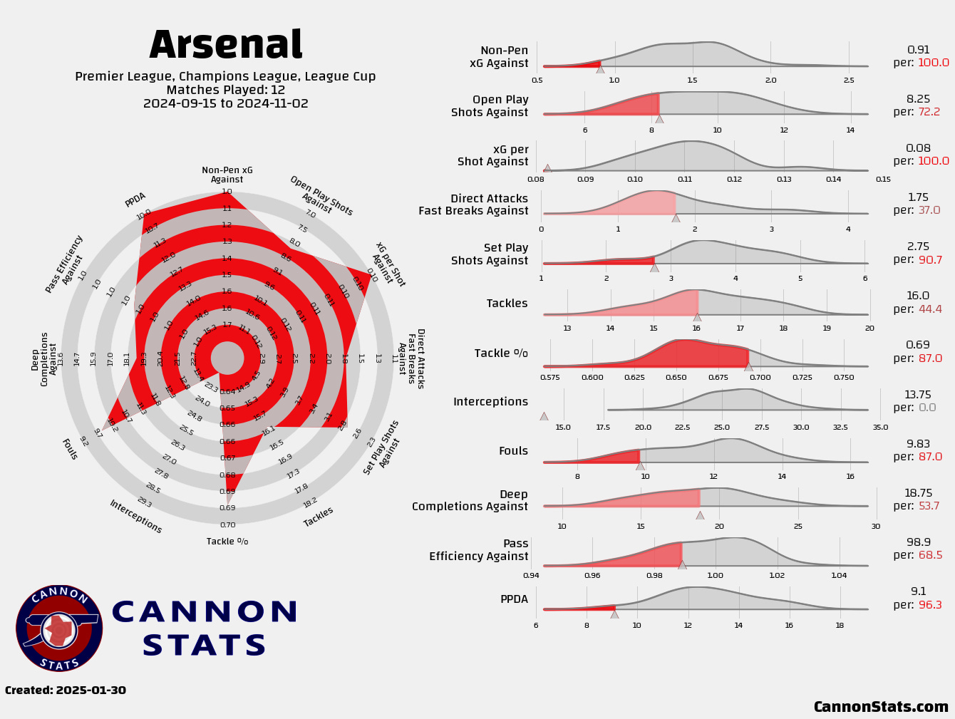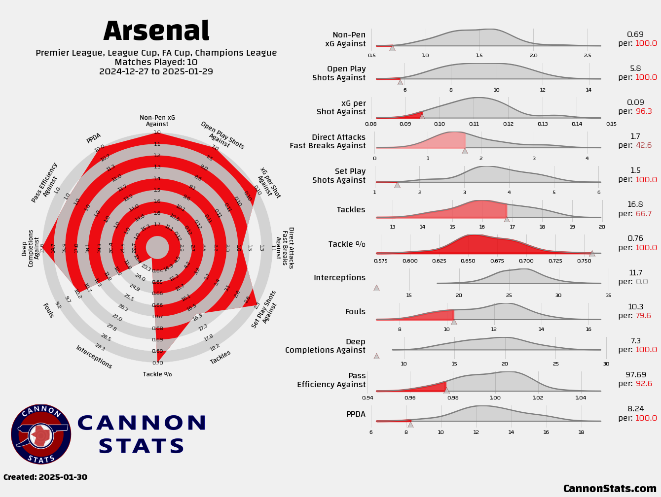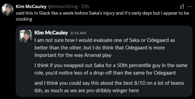 Something that is a bit surprising is that the defensive numbers look basically unchanged. I have come to think of Odegaard as a key player for the press and how Arsenal stop teams from progressing but they have been able to minimize the impact without the captain.