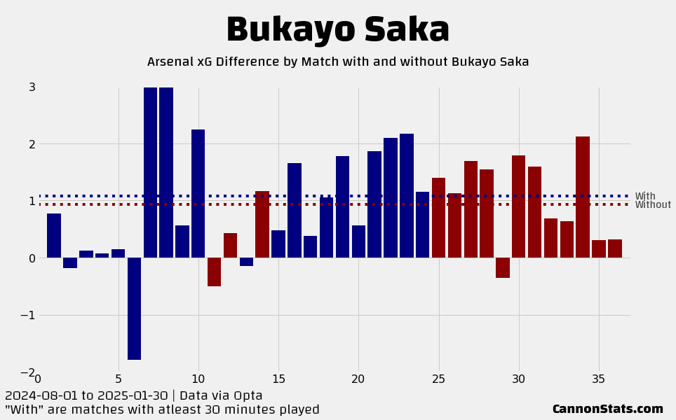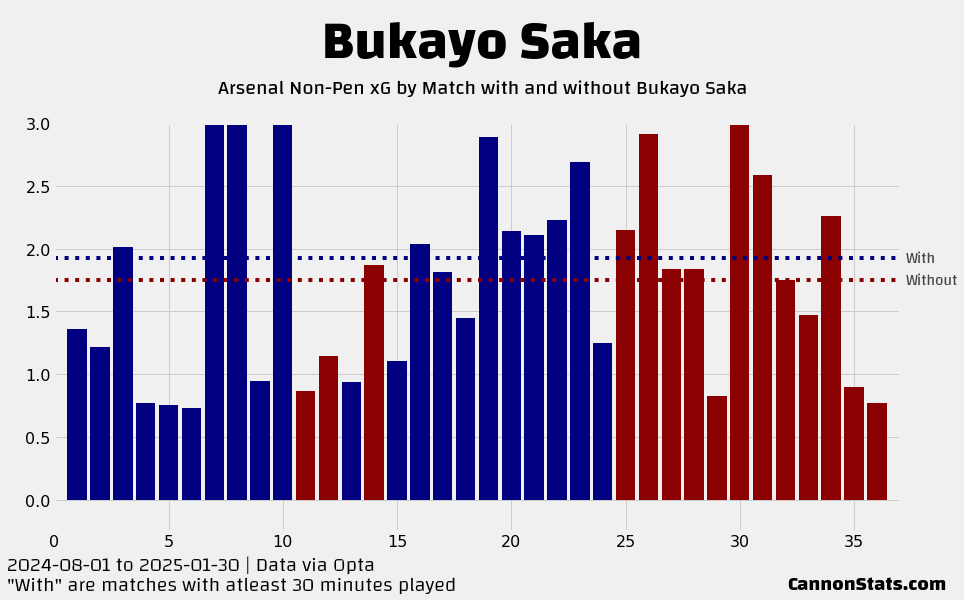 They went 4-2-0 in the Premier League, 2-0-0 in the Champions League, 0-1-0 in the FA Cup, and 0-0-1 in the League Cup. Here is what the stats looked like with Saka injured for Arsenal: