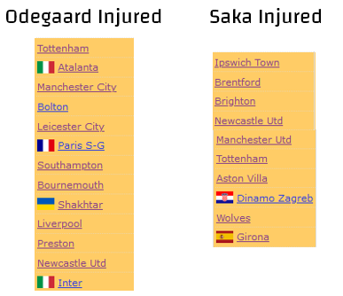 They went 3-2-2 in the Premier League, 1-1-1 in the Champions League, and 2-0-0 in the League Cup. Here is what the stats looked like with Odegaard injured for Arsenal: