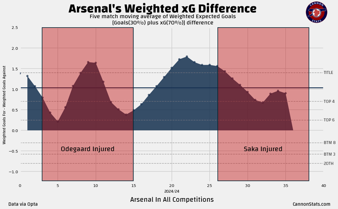Gun to my head I think that Arsenal are built more around the unique skill of Odegaard and that makes missing him a larger impact but the numbers suggest that this is a very close and not cut and dry judgement. It does also highlight just how hard it has been for Arsenal to have played 23 of the 36 matches (64%) this season where one or both of their key players have been injured, that’s a tough way to try and achieve the big things that Arsenal wanted this season.