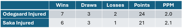 The strength of schedule isn’t exactly even here but it is probably close enough, the time with Odegaard injured is also effected by two red cards, while the time with Saka only has the one red card to effect things.