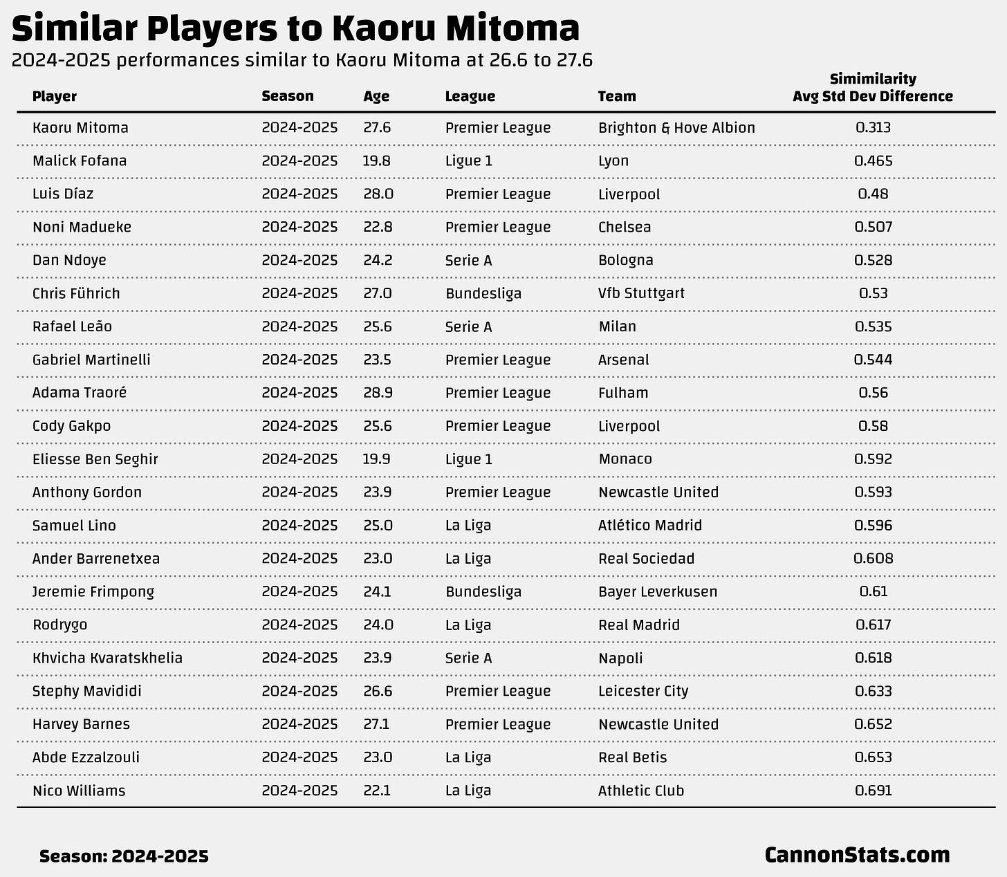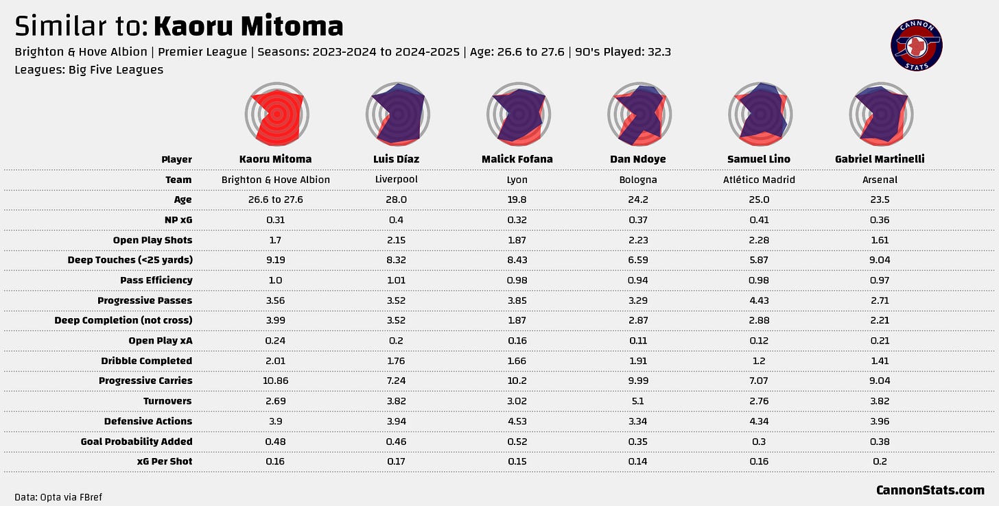 Player three is Kaoru Mitoma, I included him because he is a player that I have long admired and while it would be hard/expensive, it might be possible to pry him out of Brighton. He represents a more shot/goal heavy type player that I think many people (shown perhaps to be correct) want from this position.