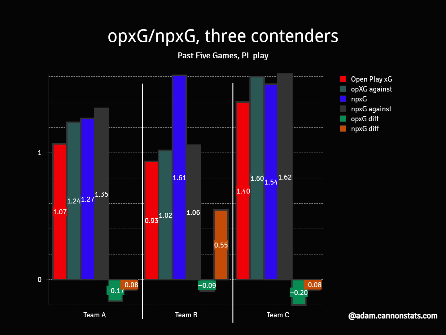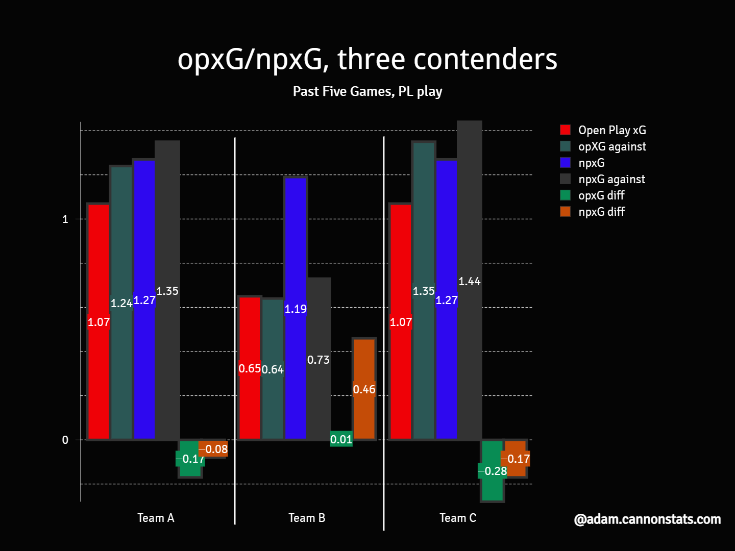 I put together this table today, showing open play and non-penalty production for and against, of the three sides in the race. Everybody loves a tall red bar and a tall blue bar, and that’s definitely the ideal here, but having a green bar and an orange bar below zero is very much not good.