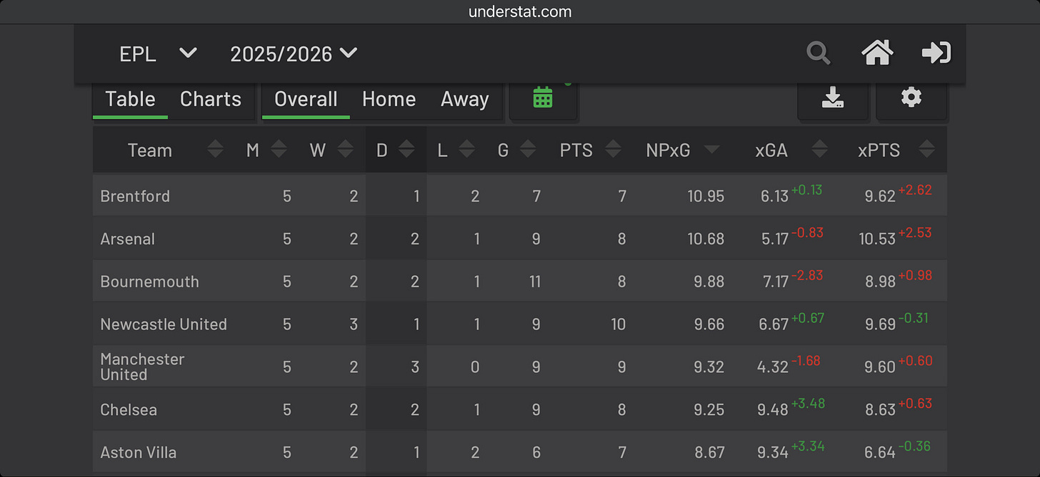I was also particularly taken aback when I learned that over the past five, there’s only one club in the league with more non-penalty xG than Arsenal, and that’s Brentford. And they just got beat by Forest, 2-0! Small world.