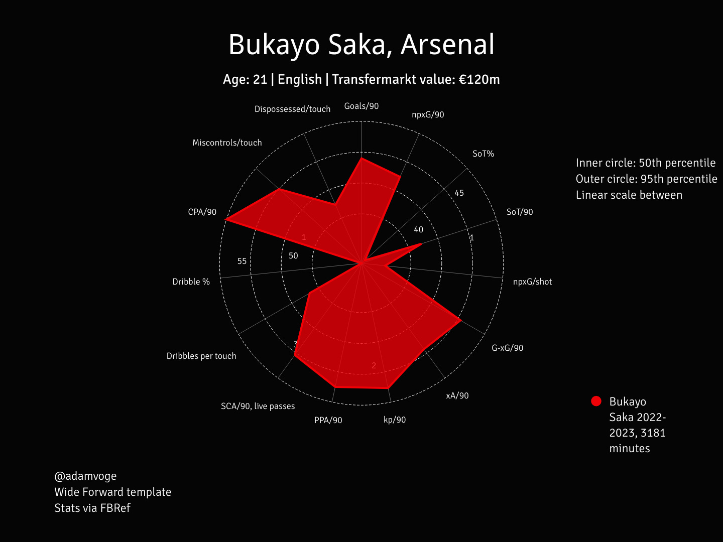 I’ve also said before that Saka’s game is one that encompasses more than statistics — he brings just as much value, for instance, in his knowledge of space and body shape and his willingness to occupy multiple defenders. It’s incredible for a player of his age.