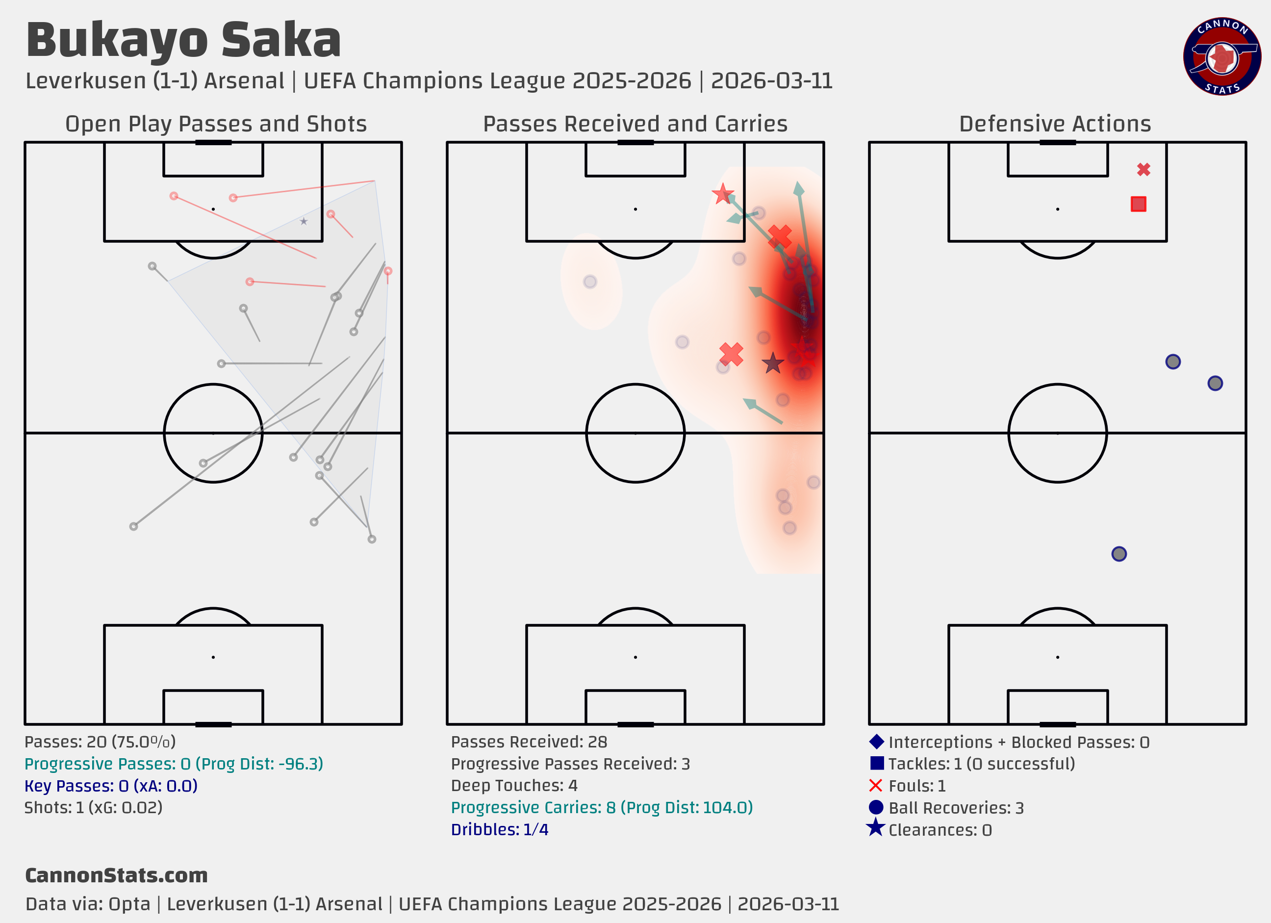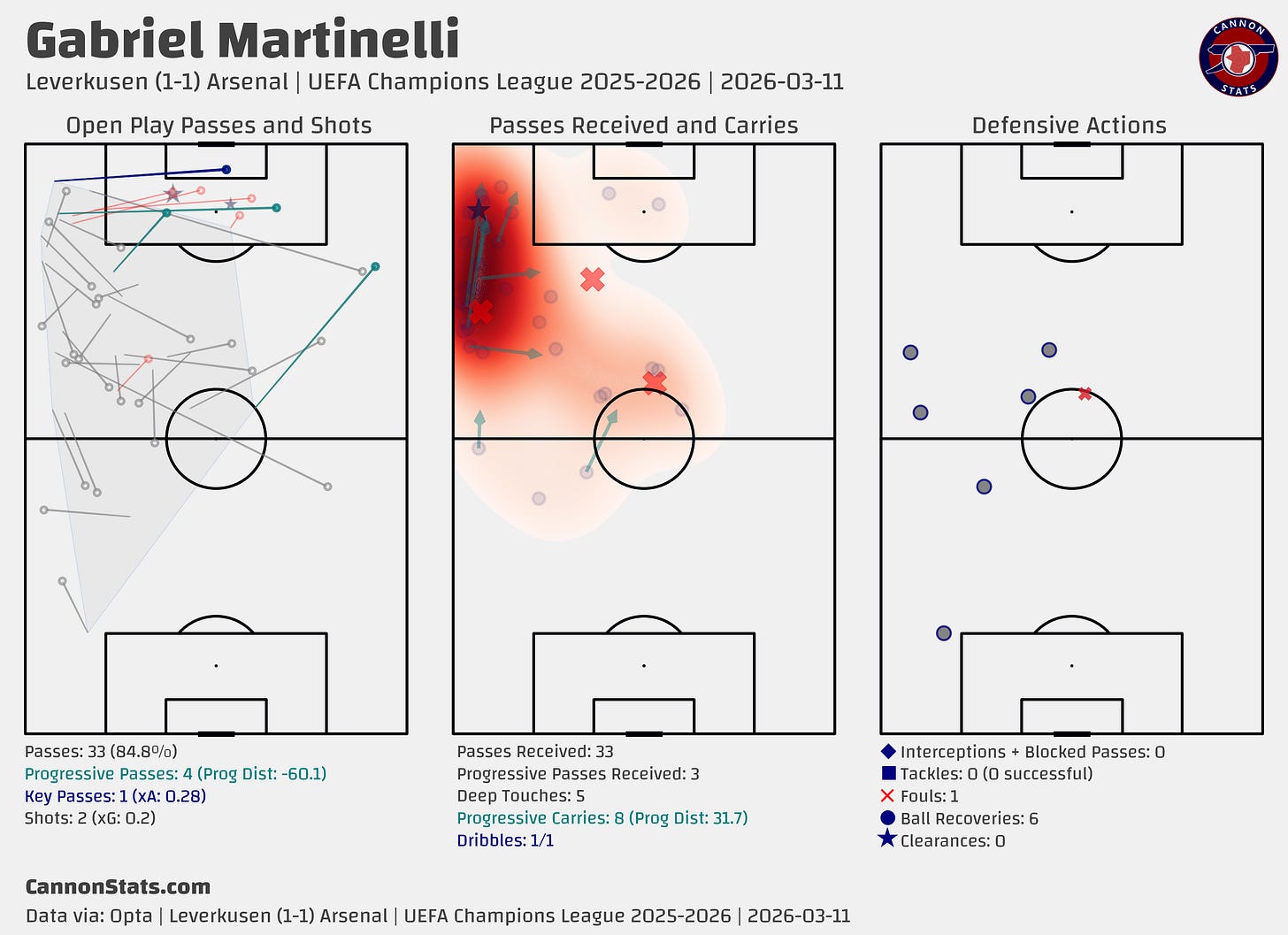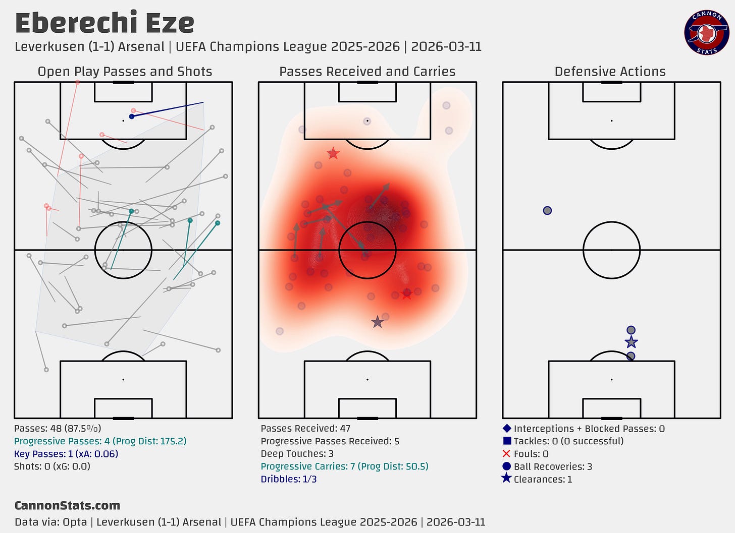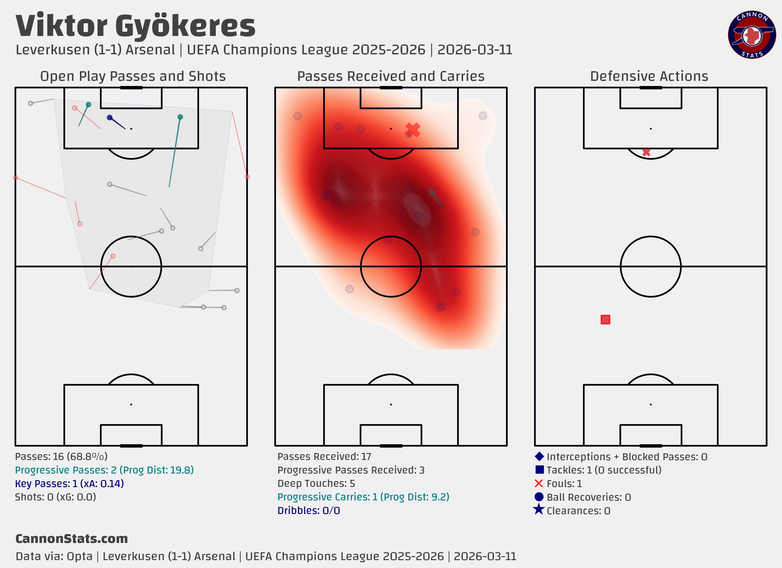 He was the only Arsenal player to take more than 1 shot (that’s a problem right there), he assisted the biggest non-penalty chance of the night (Timber’s 84th minute header) and led the team in progressive passes. This is especially clear compared to his starting peers in the forward line who were off of it, especially after the bright opening period.