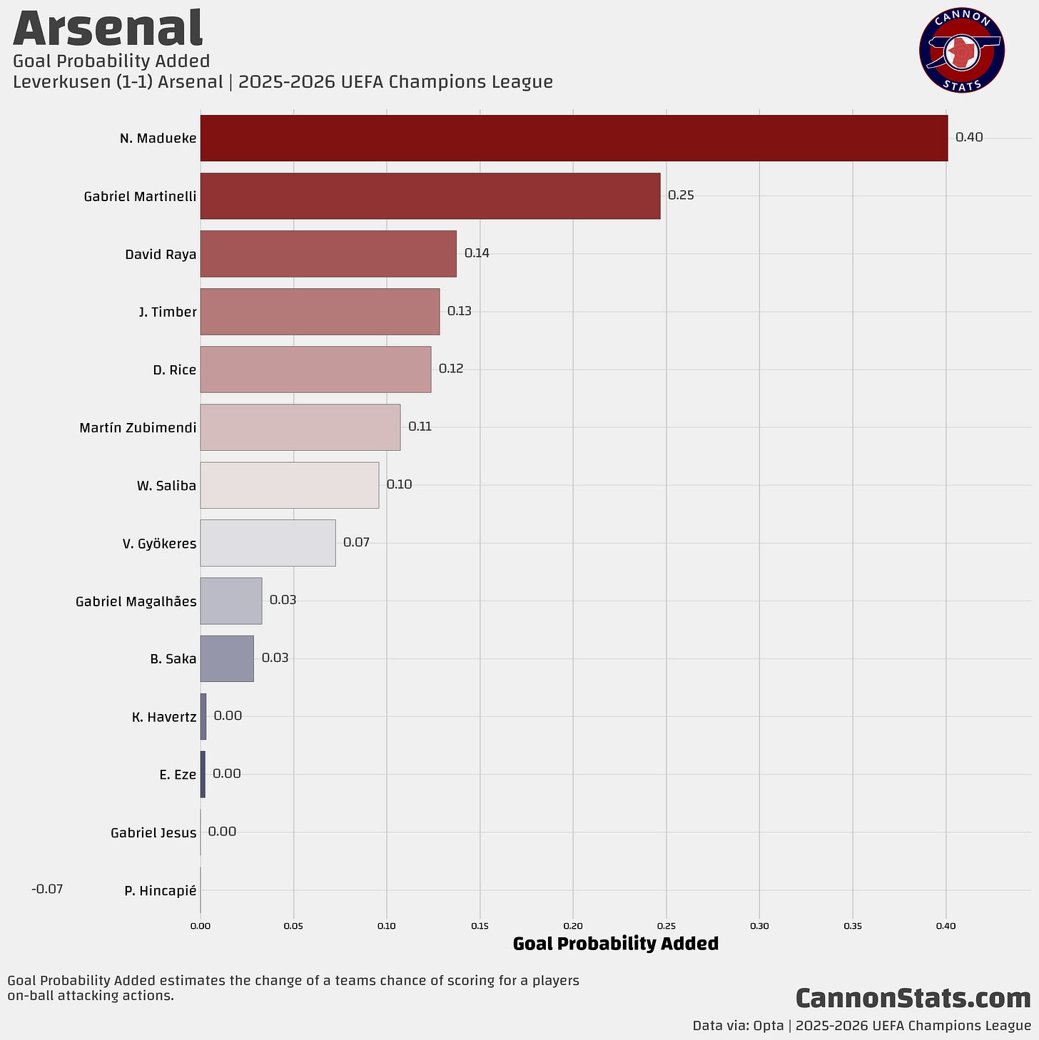 This isn’t the be all, end all of things but goal probability added, is my metric that tries to tie what a player does to the team’s chances of scoring or conceding. This is generally (but not always perfectly) associated with playing well or poorly. On this he was Arsenal’s second-best player behind Noni Madueke who came on and looked exceptionally bright.