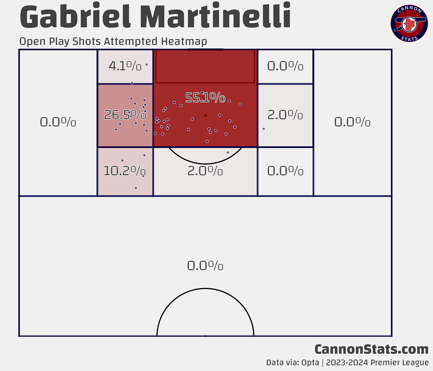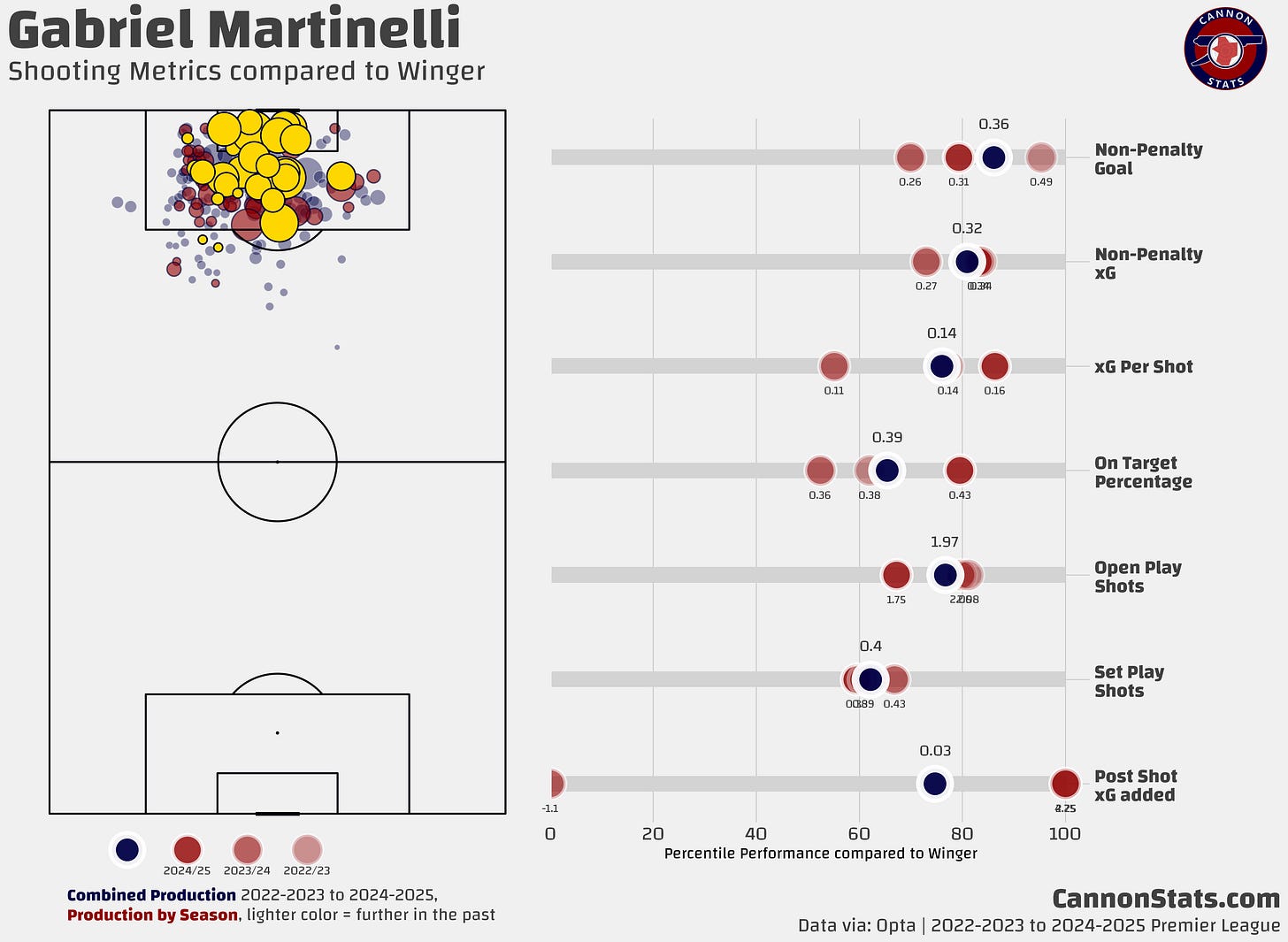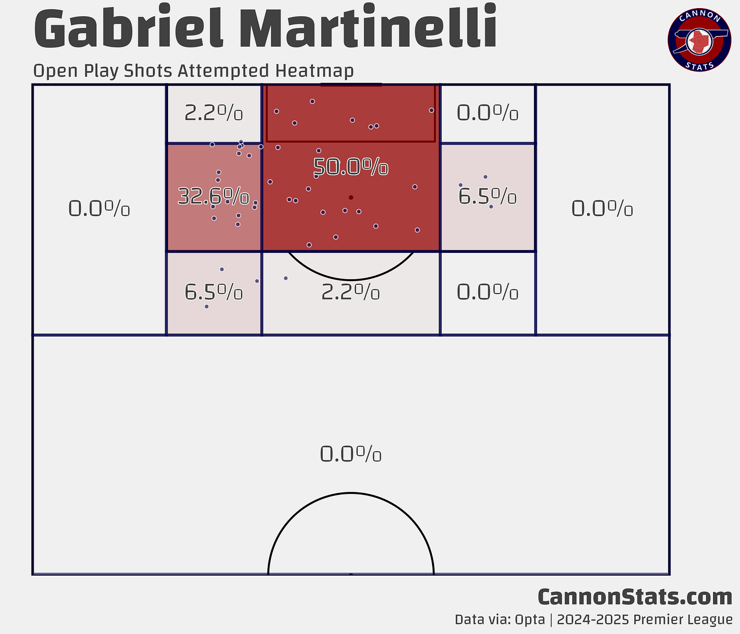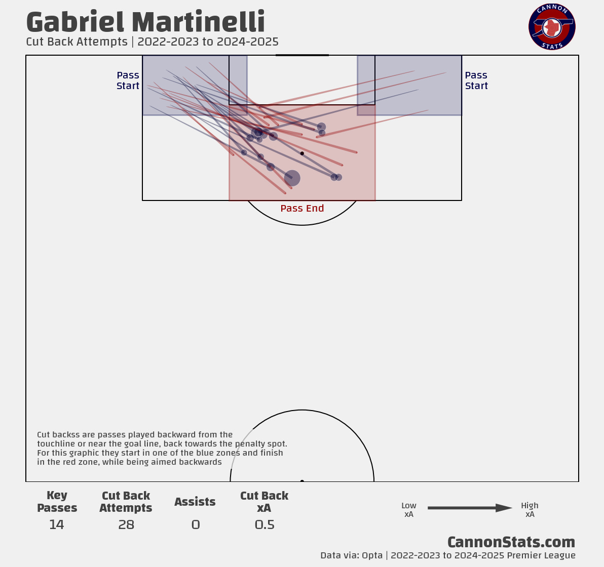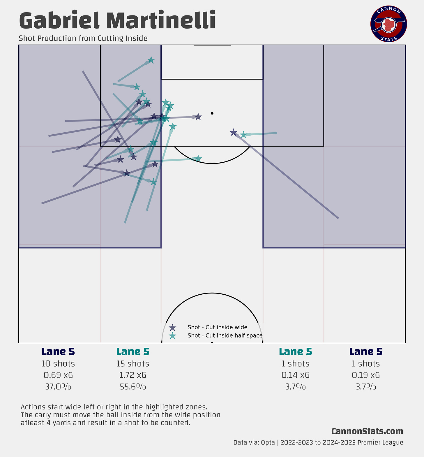 Here is a new graphic that I created for this because this topic made it something I had to know about. This looks at a player’s ability to move the ball carrying inside from a wide position and generating a shot. This isn’t perfect and there are a few here that aren’t true “cutting in” type shots here but it’s a decent first attempt here and it does identify this issue in Martinelli’s skill set.