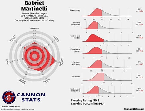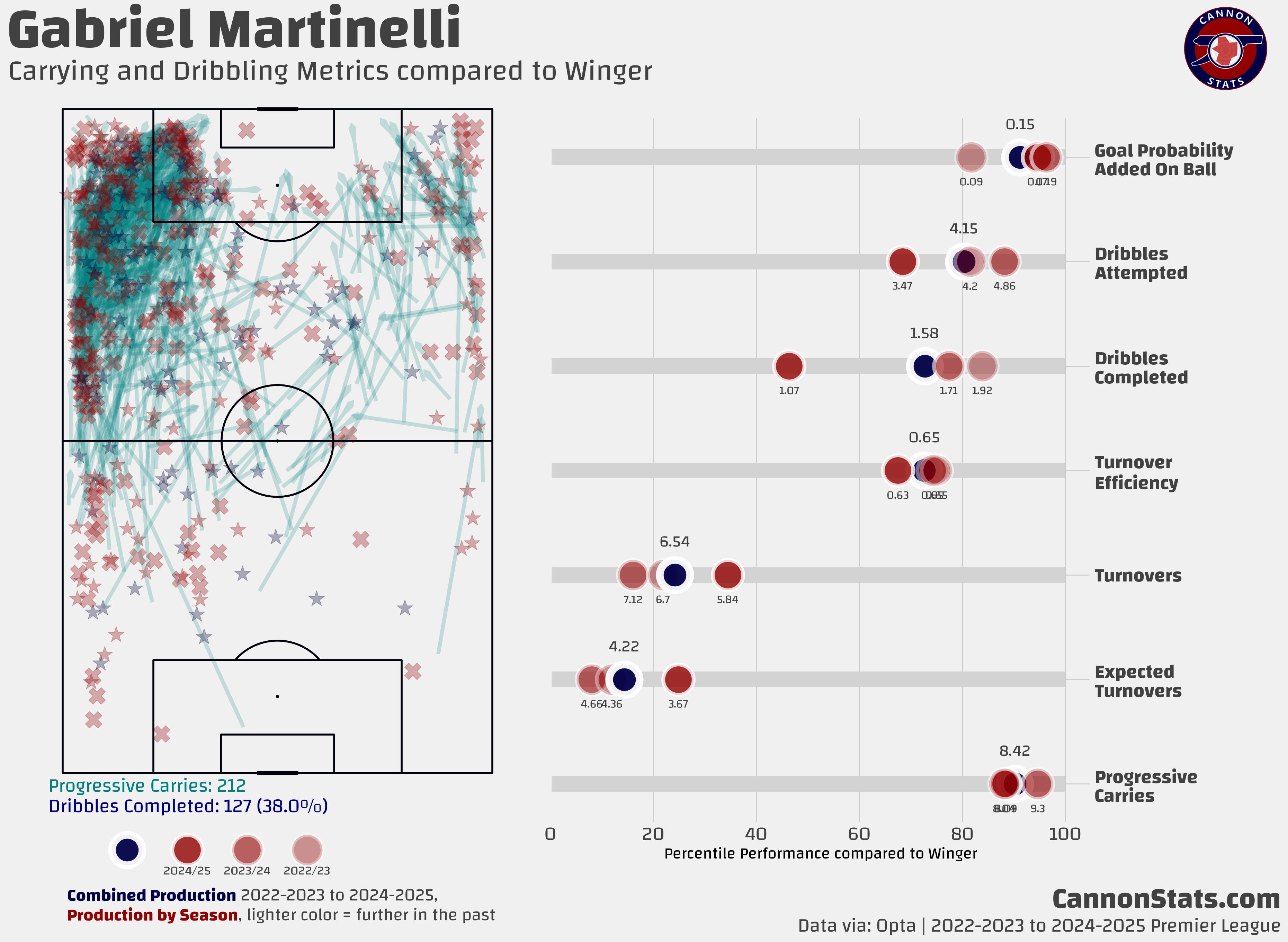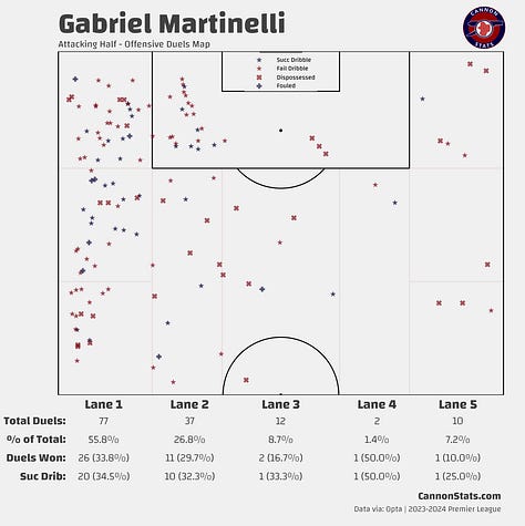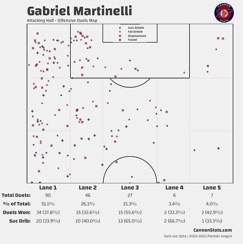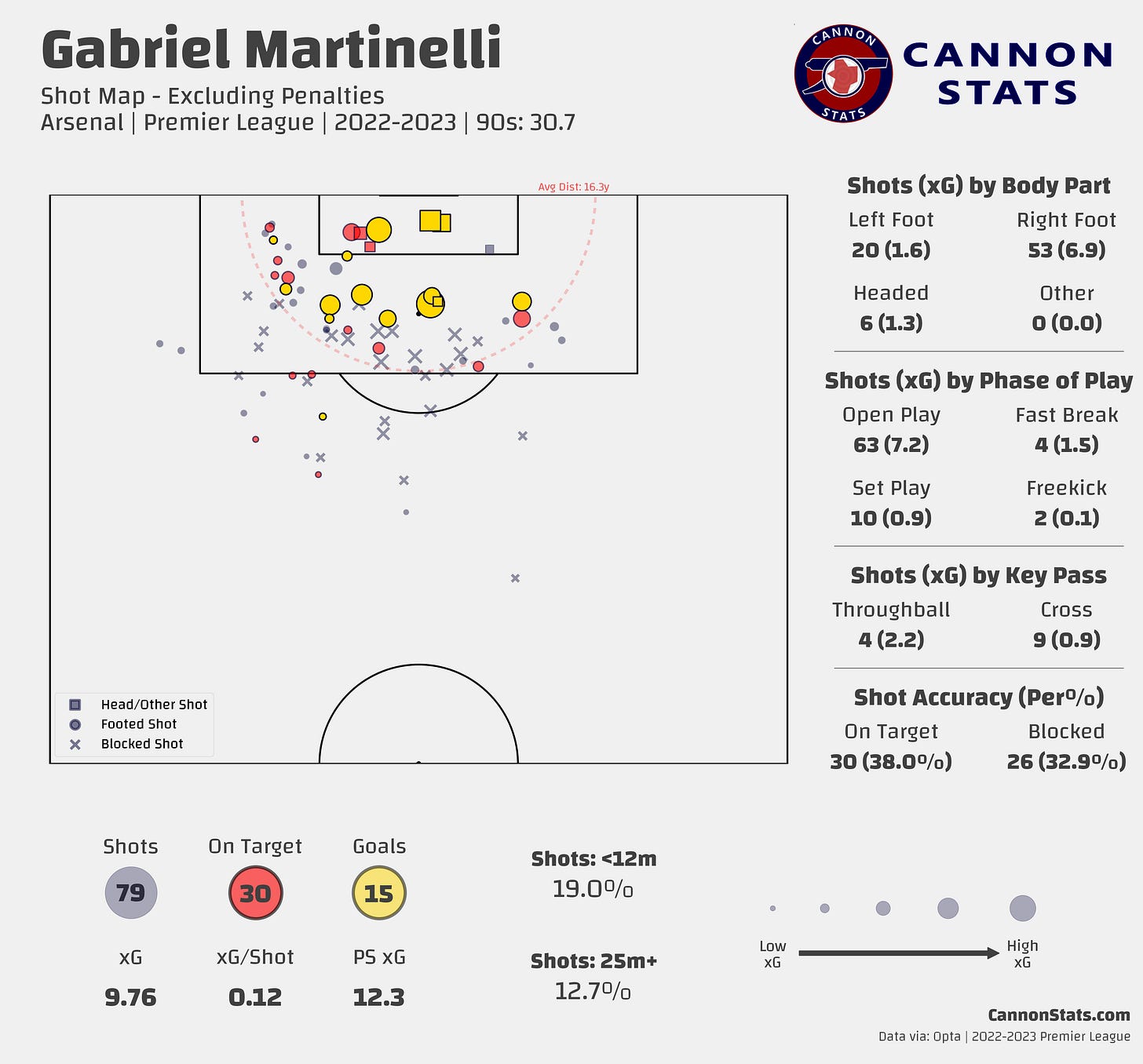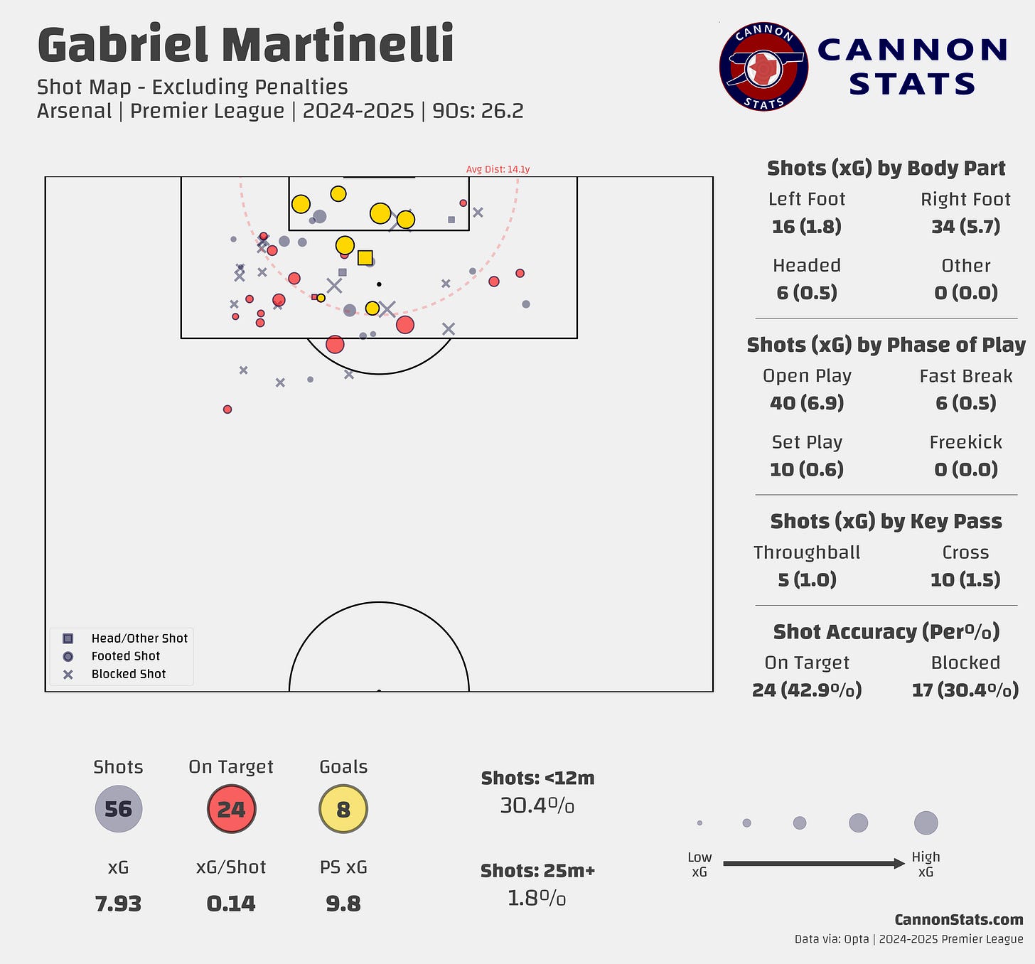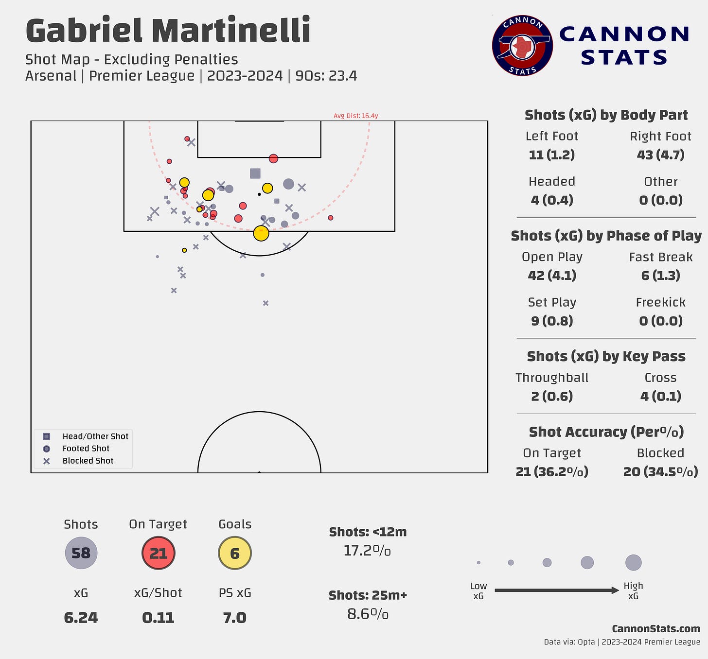 Here is a new graphic that I created for this because this topic made it something I had to know about. This looks at a player’s ability to move the ball carrying inside from a wide position and generating a shot. This isn’t perfect and there are a few here that aren’t true “cutting in” type shots here but it’s a decent first attempt here and it does identify this issue in Martinelli’s skill set.