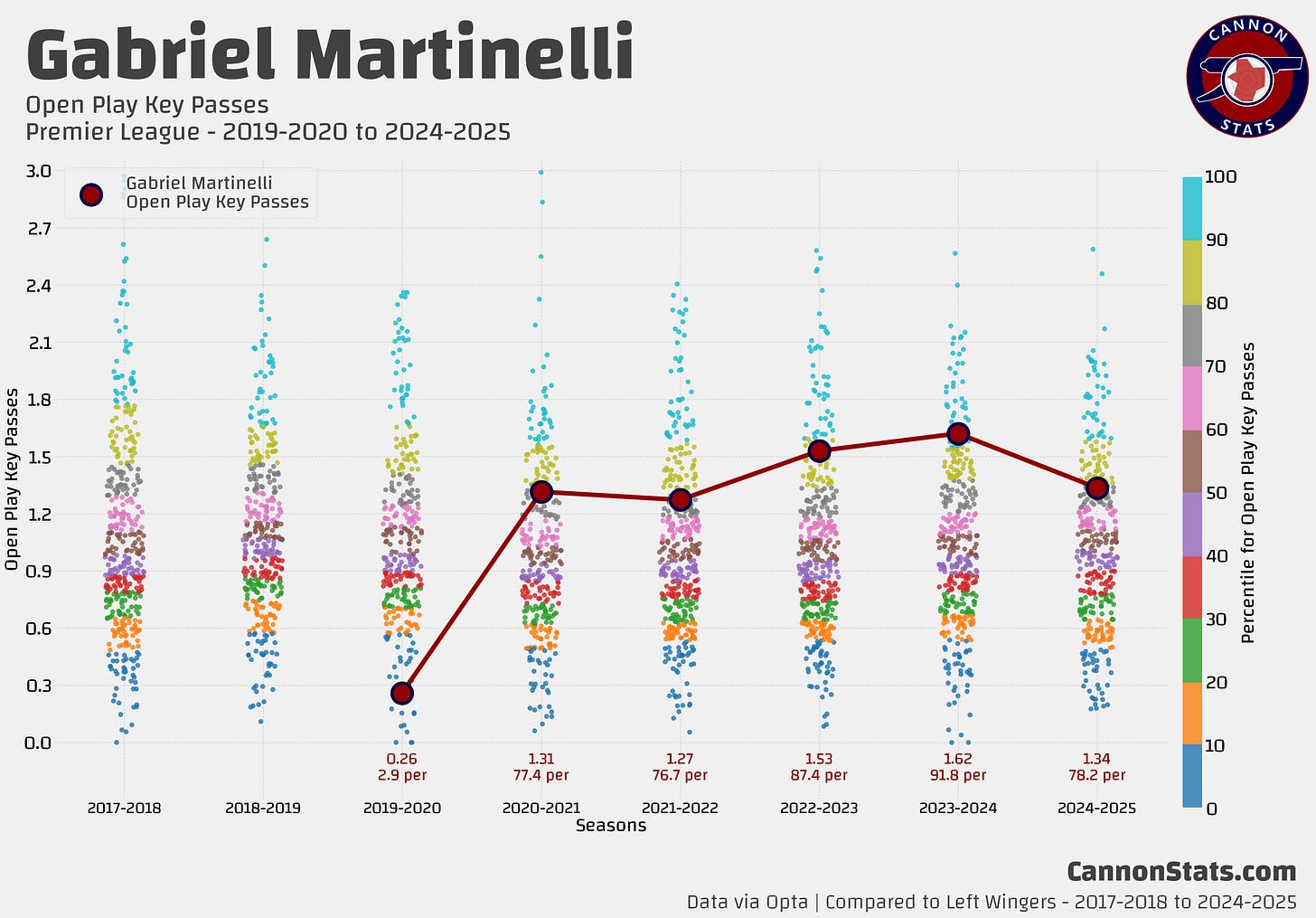 Open Play Key Passes, the best was 23/24, this current season is down 9% compared to the average the previous three years.