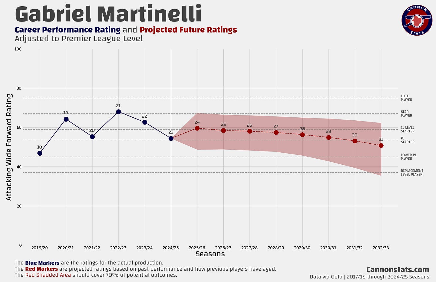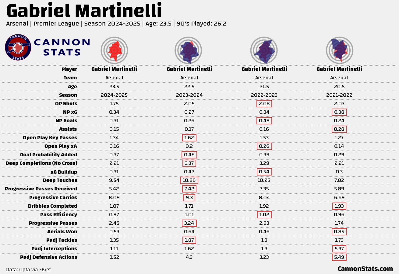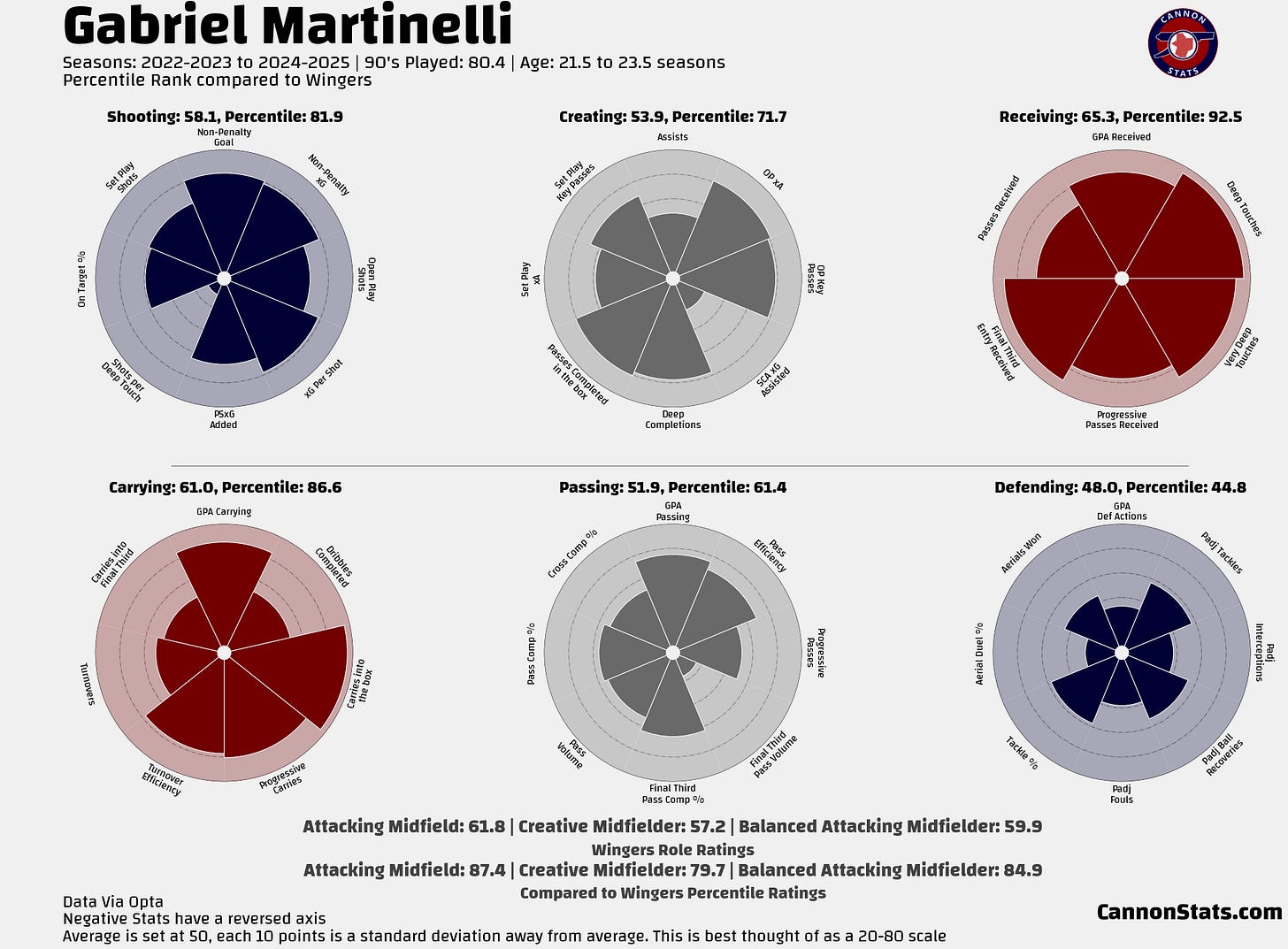 On the one hand, it is frustrating and concerning that Martinelli has seen his overall level decline but has also had patchy form. On the other hand, the view of what his level is in the wider fanbase is way out of whack with what the data shows and he is still quite a good player.