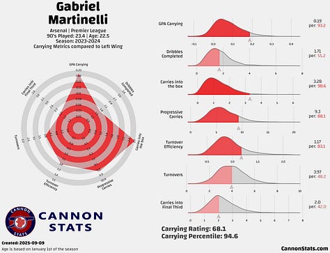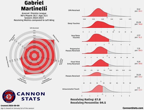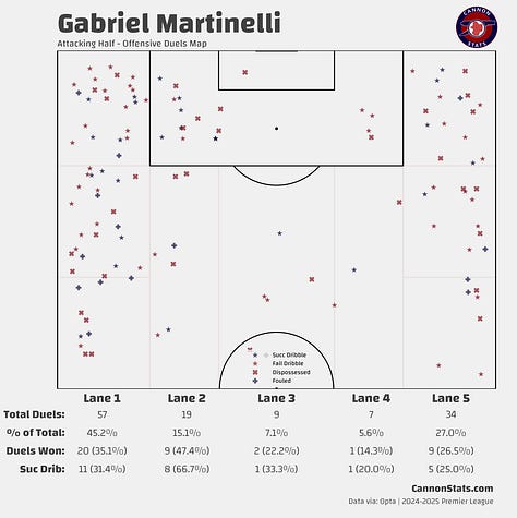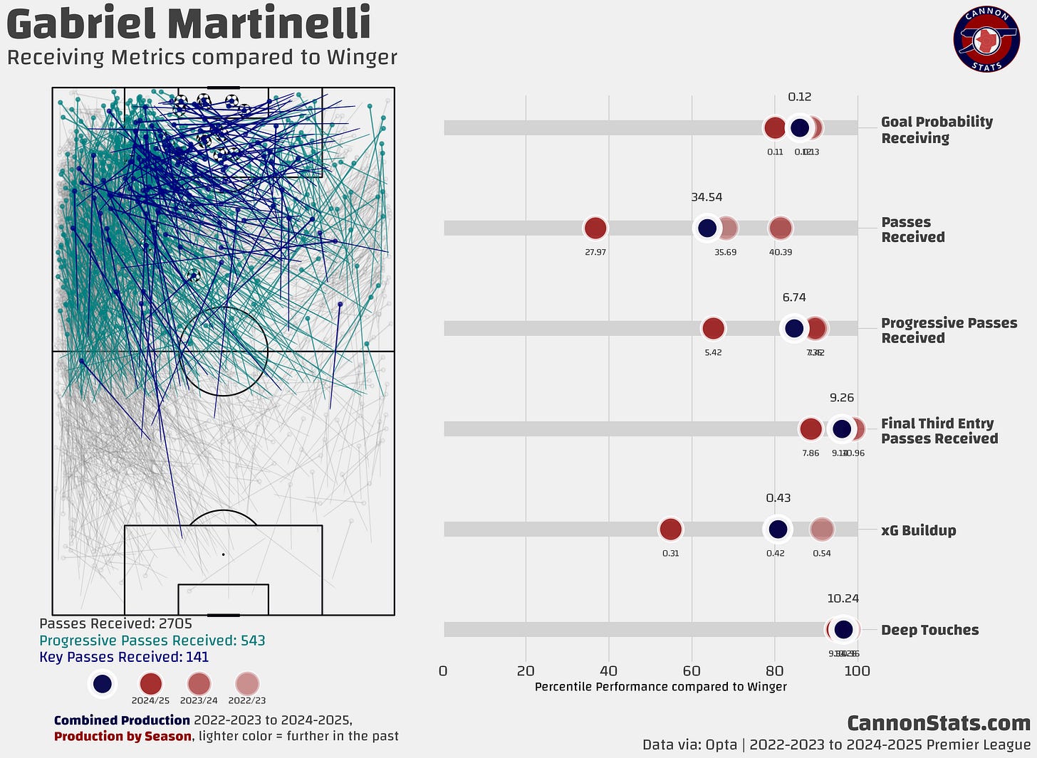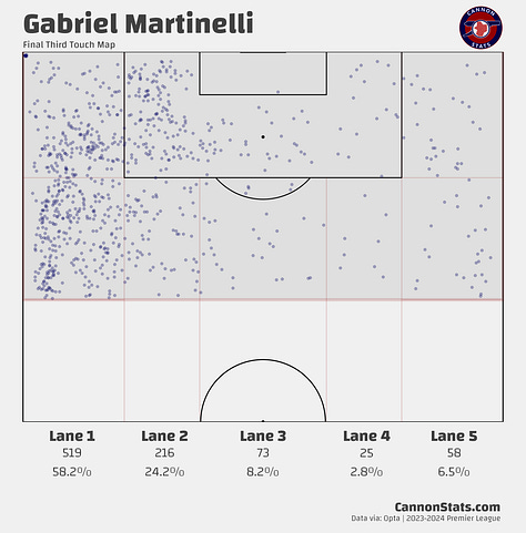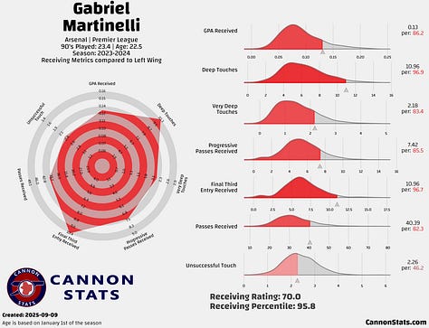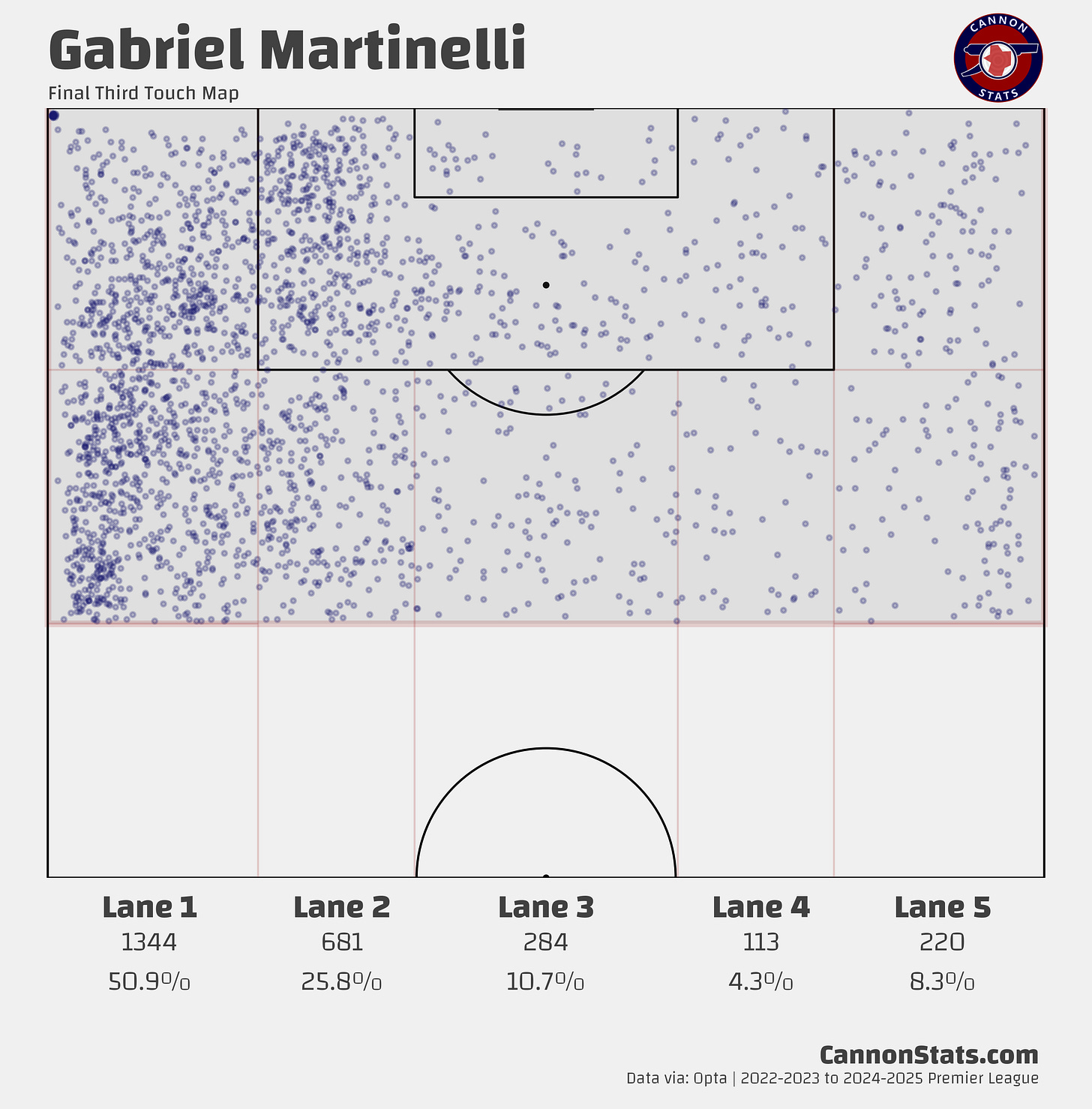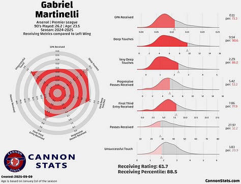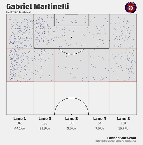 Getting the most out of Martinelli (or any left winger that Arsenal play) does likely go hand in hand with getting them more touches in those central locations. There are potential changes that we have seen in the squad that could make this possible, the team has signed Piero Hincapie and he has been a wide left player comfortable getting wide and overlapping (the incumbent left backs could be asked to provide this option more often as well). Viktor Gyokeres as a striker likes to peel out wide leaving space for the player on the left to fill central locations in those situations. There is the potential that Eberechi Eze could play in the left midfield spot and he is a player that would be comfortable filling the widest spots if the left winger moved inside.