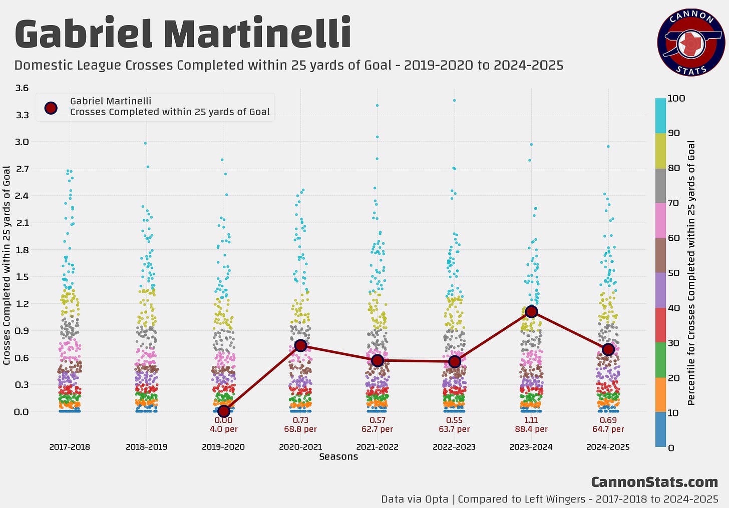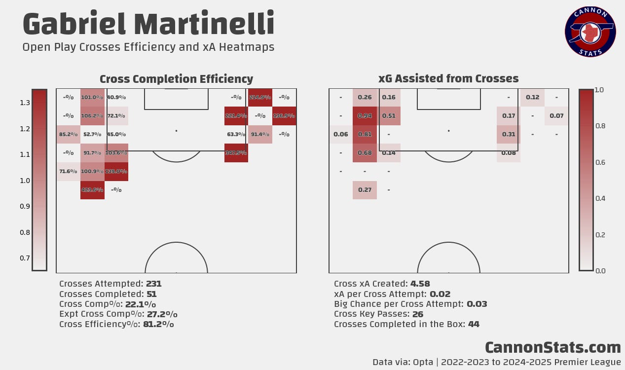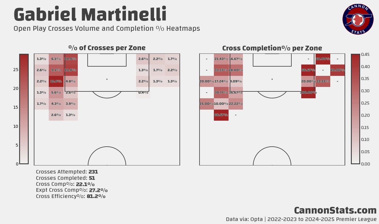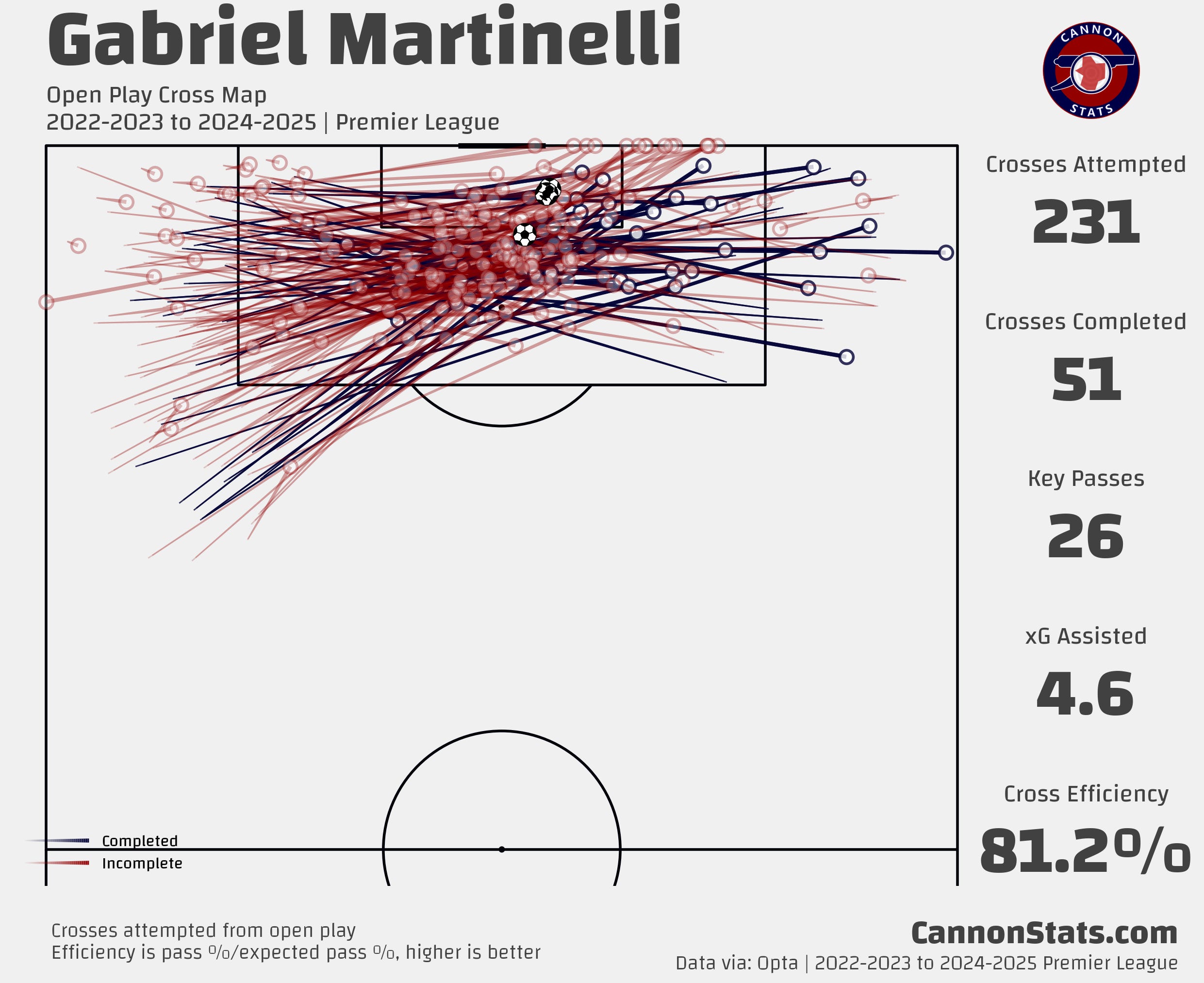 He is completing fewer crosses than expected here but he does actually have a bit better than average chances quality generated where he is 0.022 xA per cross compared to the average of all crosses of 0.013 per open play cross. This is a bit confounding and my guess at explaining it would be that Martinelli is not a bad crosser when the opportunity is there (better chance creation than average), he just too often will attempt a hopeless cross because he ran out of other options (poor completion percentage).