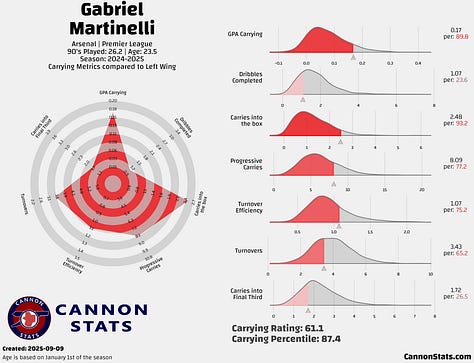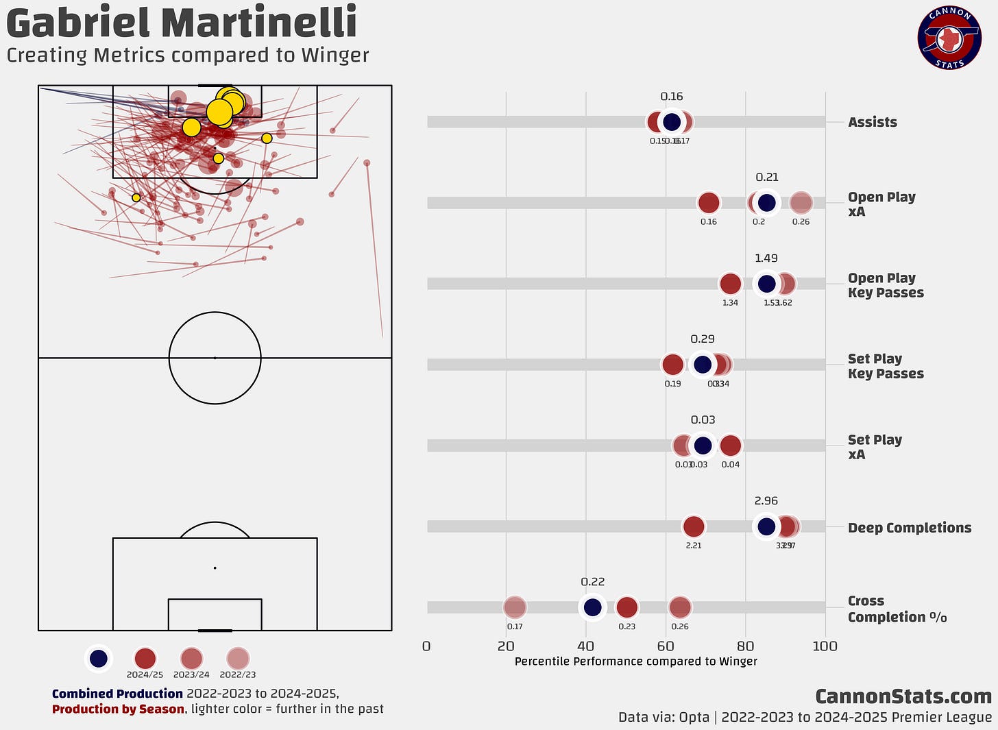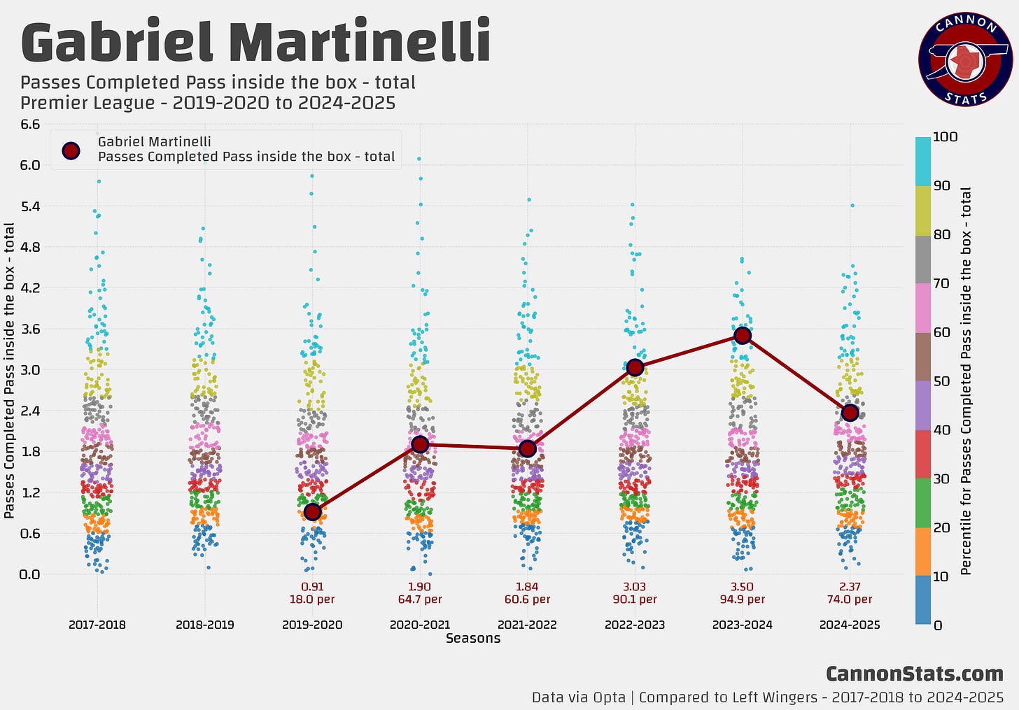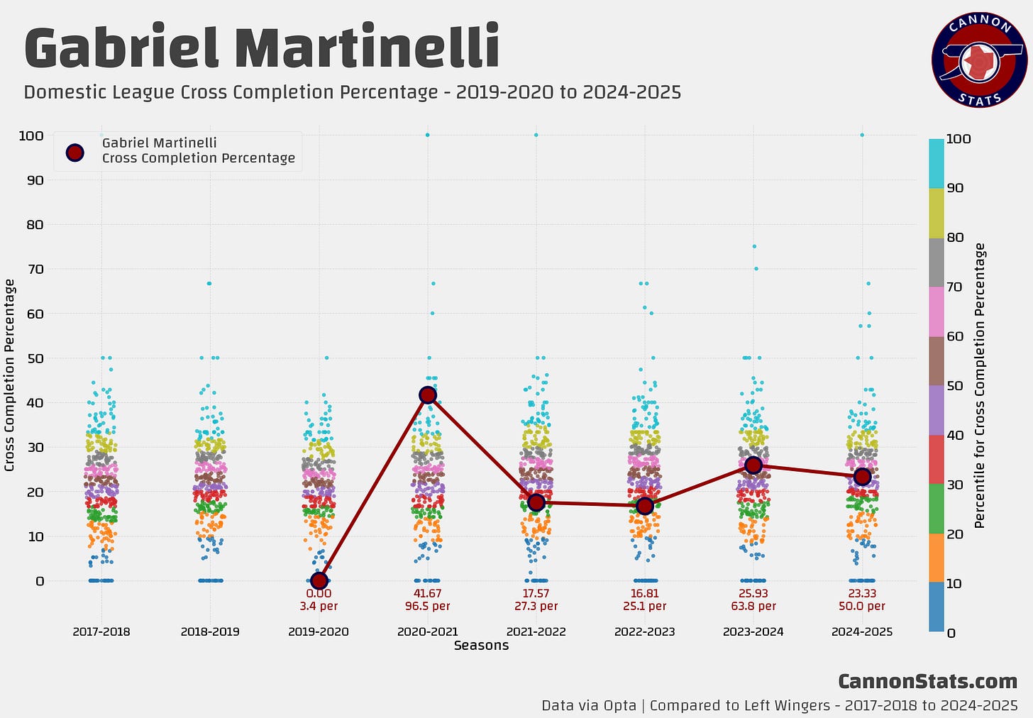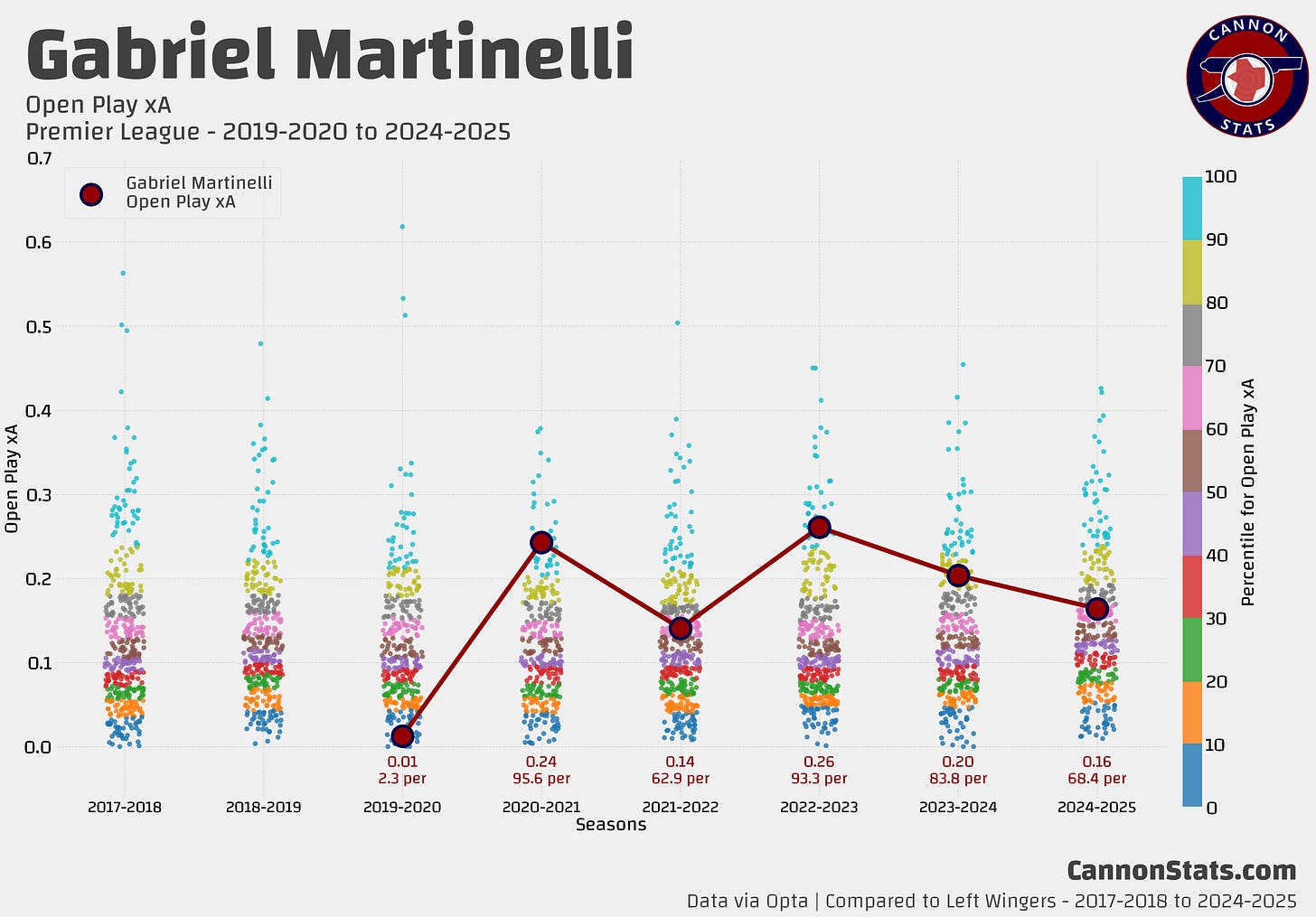 He is completing fewer crosses than expected here but he does actually have a bit better than average chances quality generated where he is 0.022 xA per cross compared to the average of all crosses of 0.013 per open play cross. This is a bit confounding and my guess at explaining it would be that Martinelli is not a bad crosser when the opportunity is there (better chance creation than average), he just too often will attempt a hopeless cross because he ran out of other options (poor completion percentage).