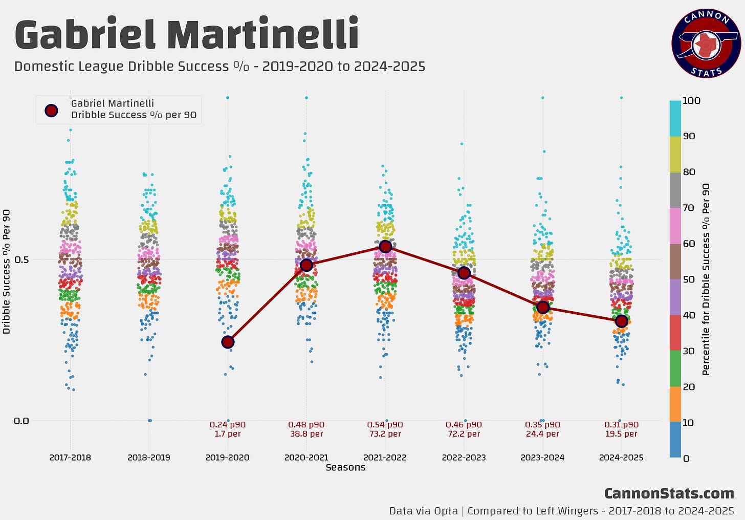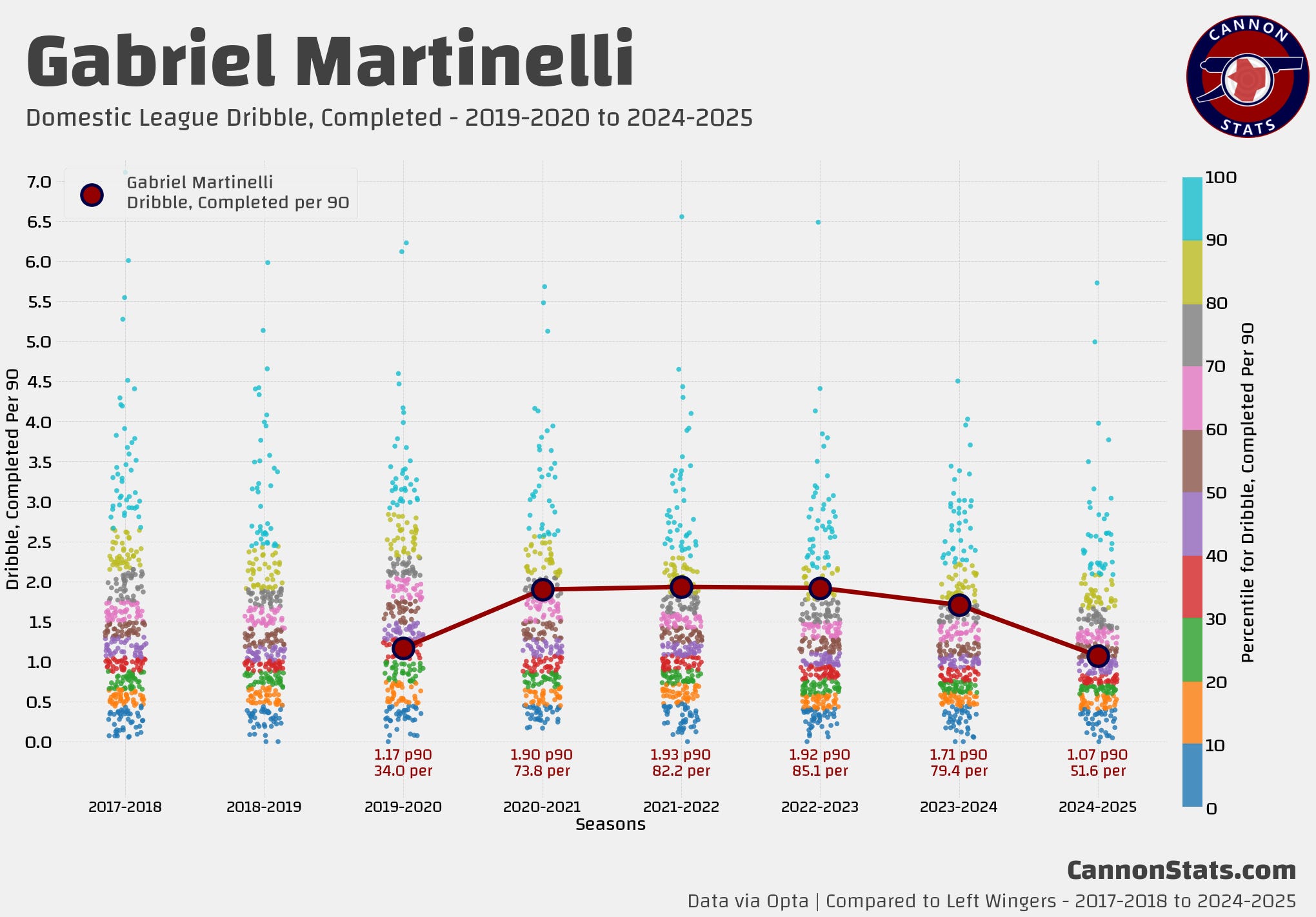 Like many wingers before him it looks like he might have peaked at being able to beat his man in this early 20’s, Martinelli’s unfortunately might have come especially early in his 20s. Here is how his successful dribbles look for his career compared to other left wingers for each season.
