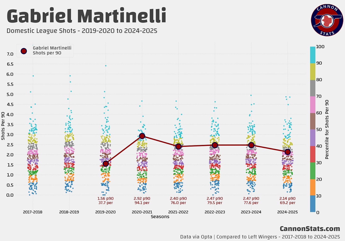 The shots and goals are the area of Martinelli’s game that have (had?) the most potential to add superstar value.