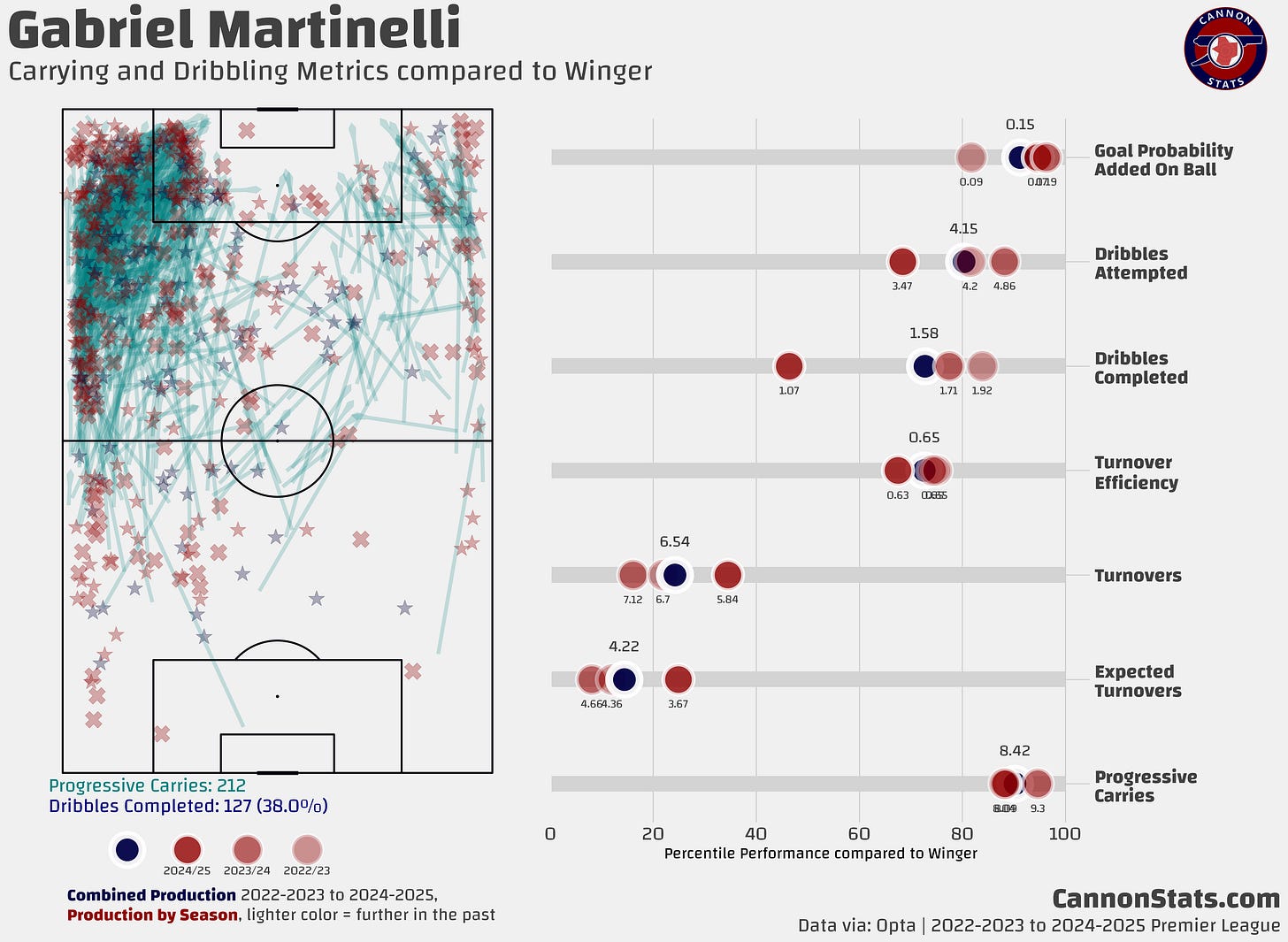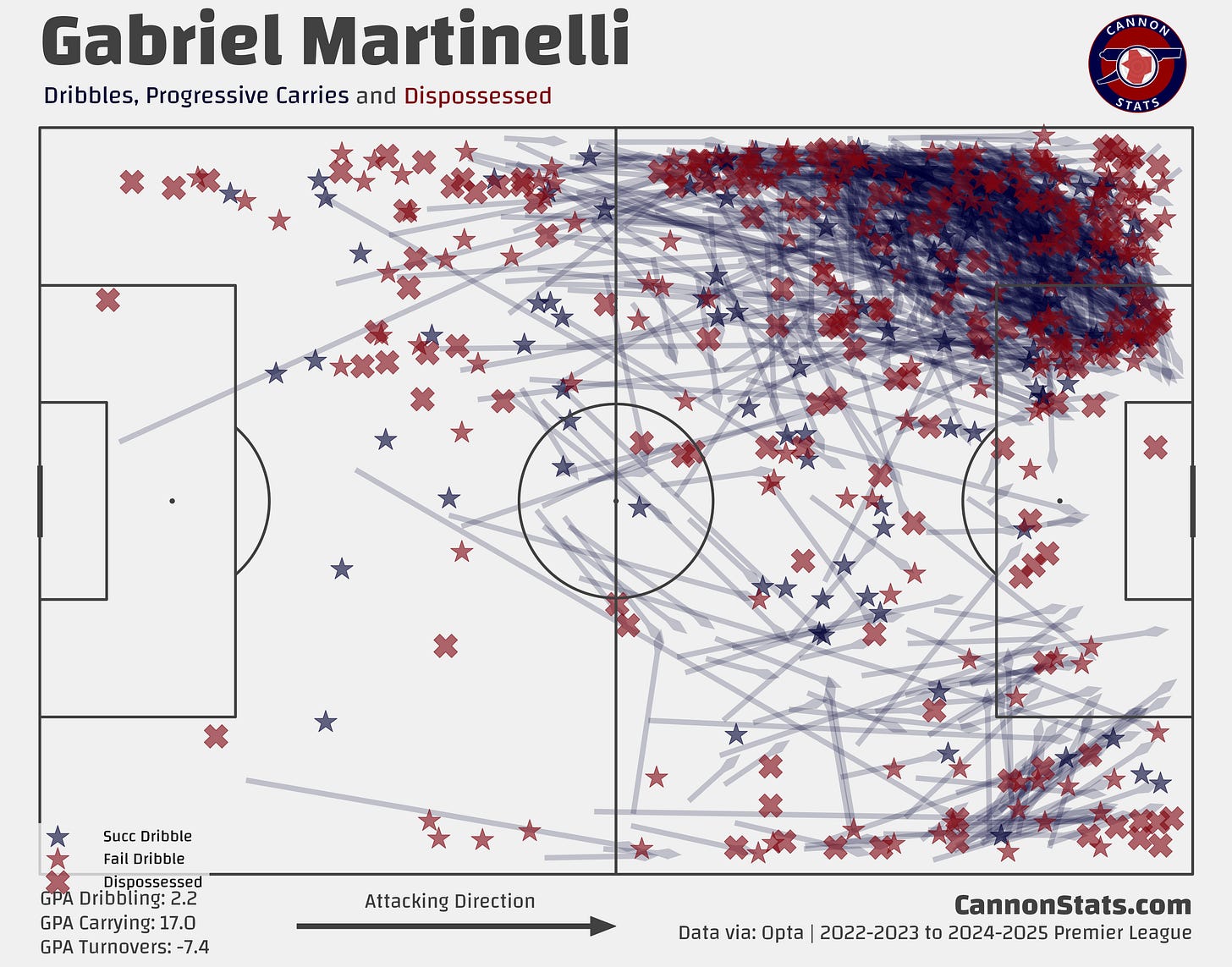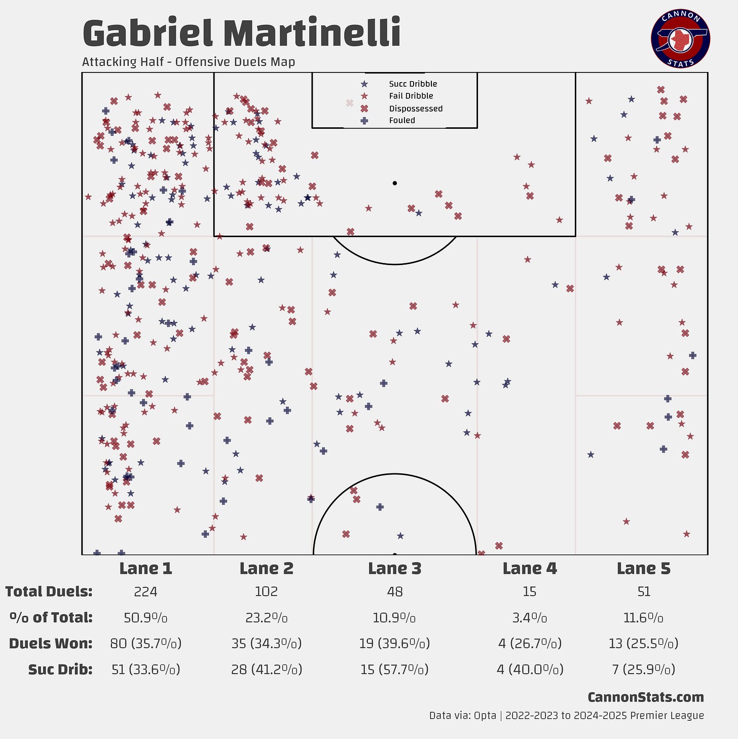 For Martinelli, even when he is wide, he is not able to get the better of his defender often enough these last two seasons.