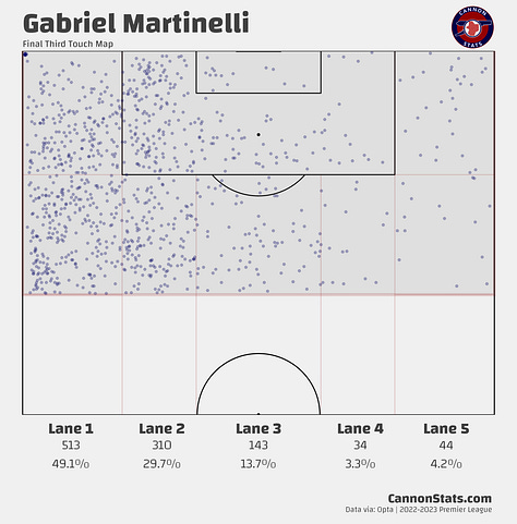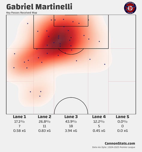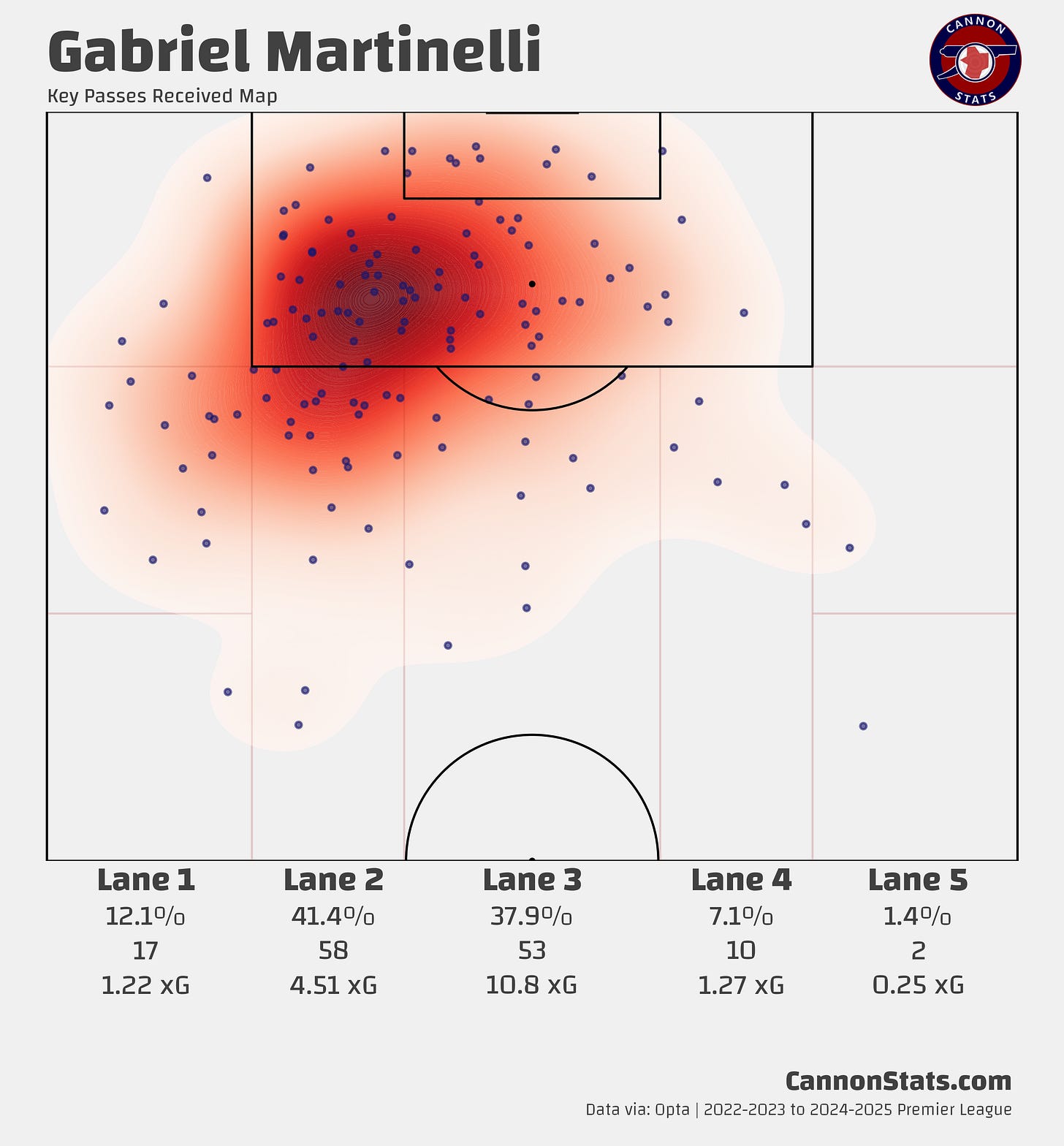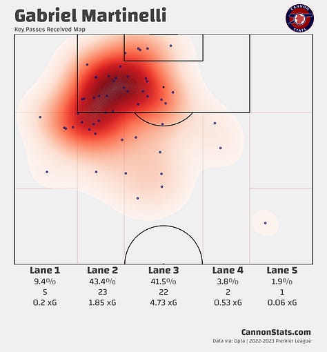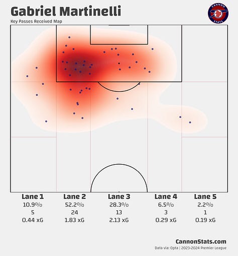 Tying this back to shooting, there is a pretty obvious connection that central passes received in the final third are more likely to result in a player taking a shot and for Martinelli that is no different.