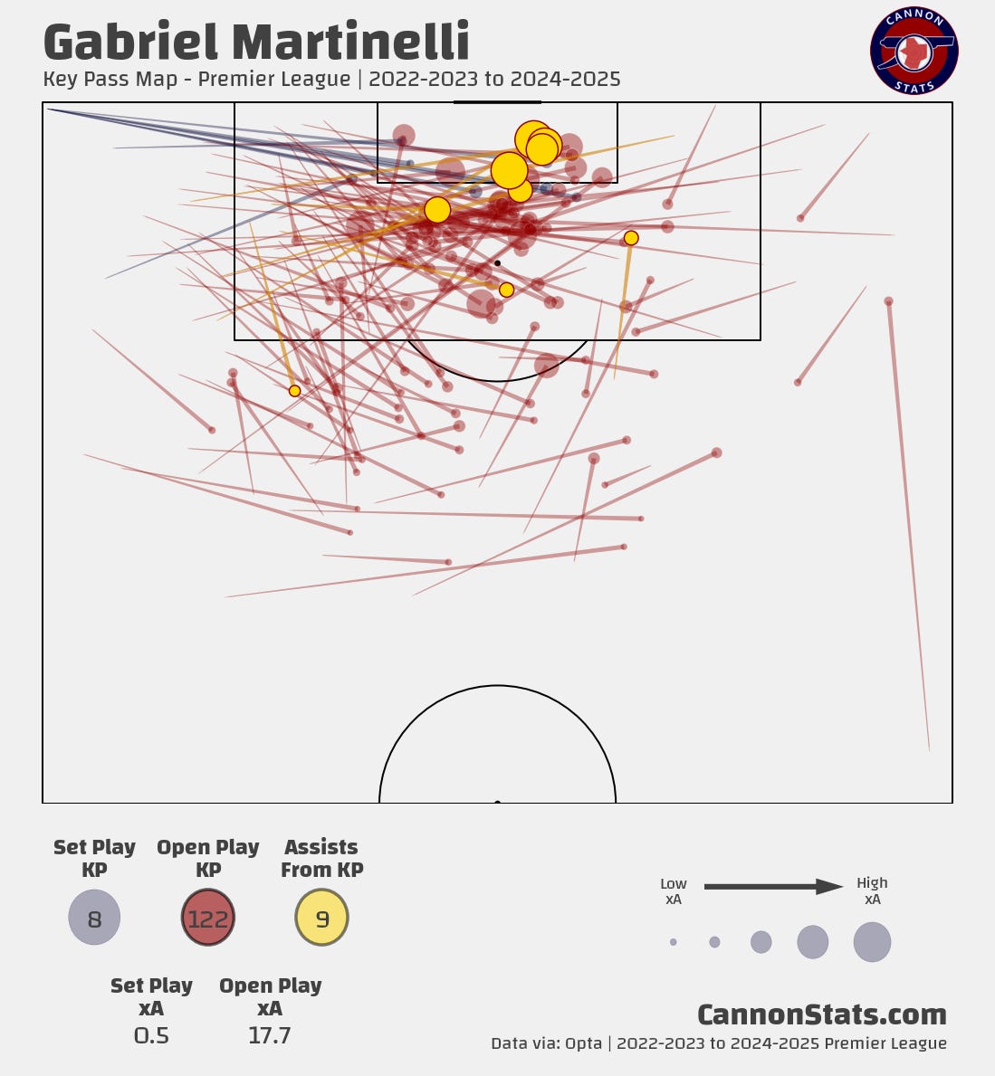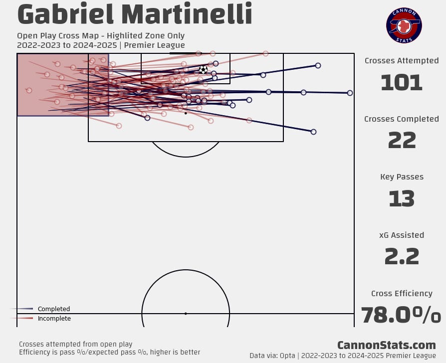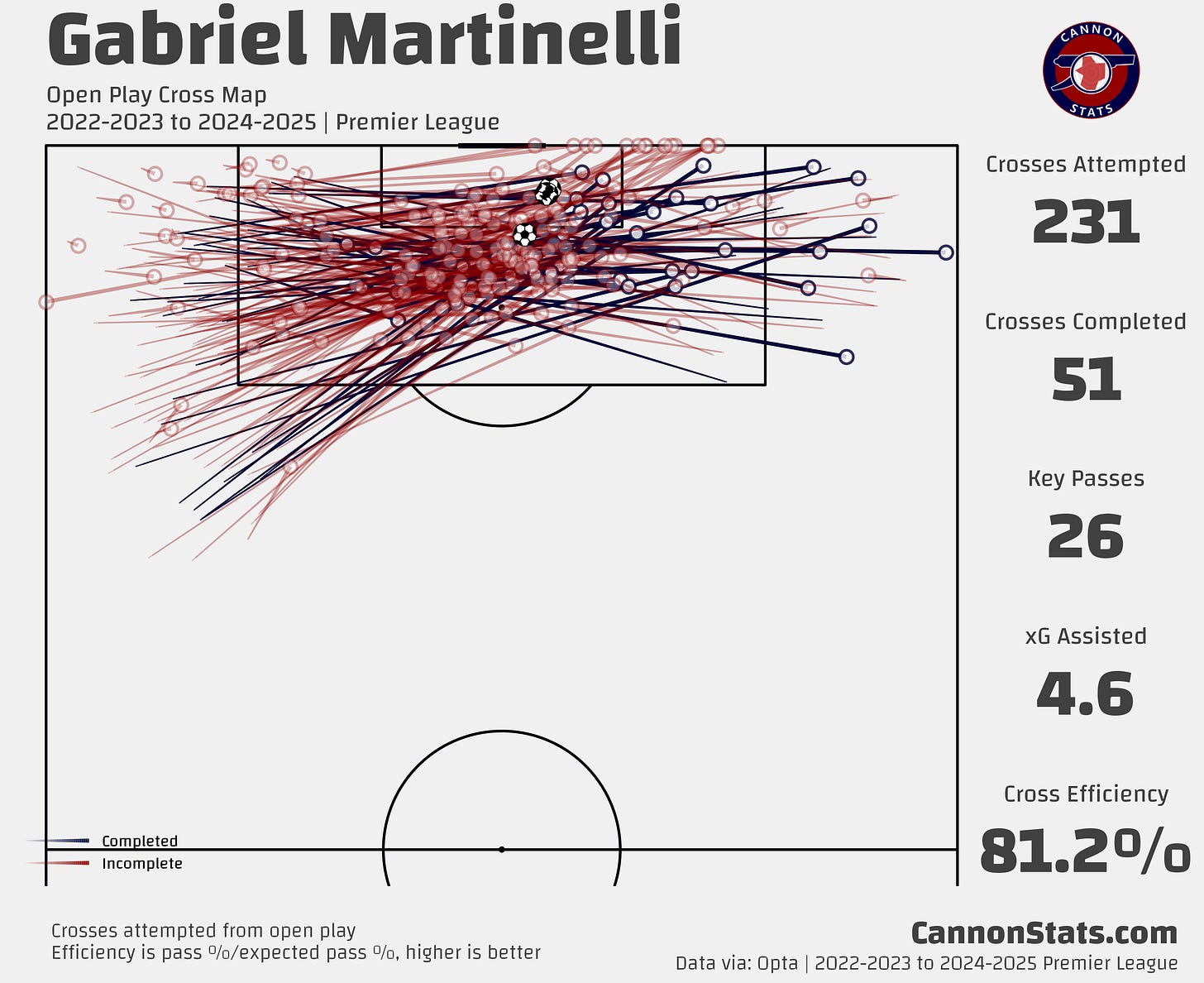 I think Martinelli can deliver a good ball from wide but given above he too often finds himself in a poor situation and that ups the difficulty level. Crosses are already a tough way to create a chance, and they don’t need that extra degree of difficulty added. Here are the open play crosses from Martinelli over the last three seasons.