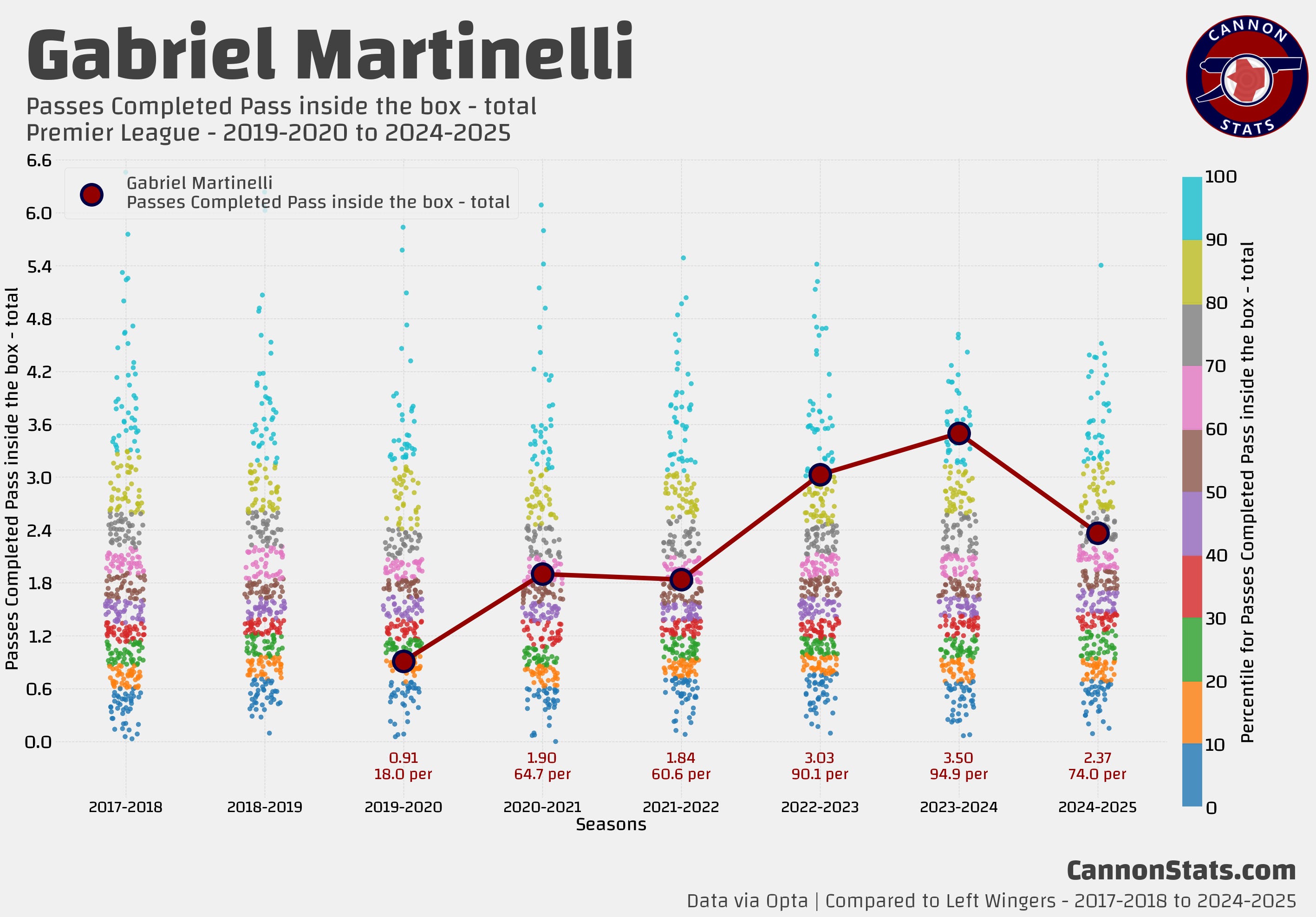 The absolute elite wide players will be taking a bit more than a shot per 90 in those central zones in the box and Martinelli is just off of that taking 0.9 shots from open play in these spots.