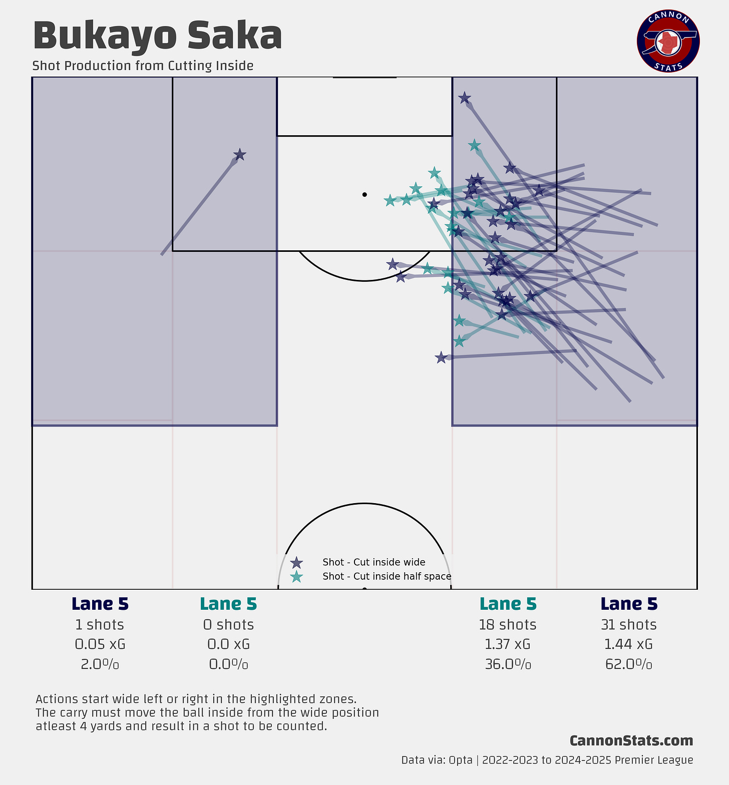 Here is what Bukayo Saka has done over the last three seasons from the opposite side to be able to receive wide and be able to generate his own shot through cutting inside.