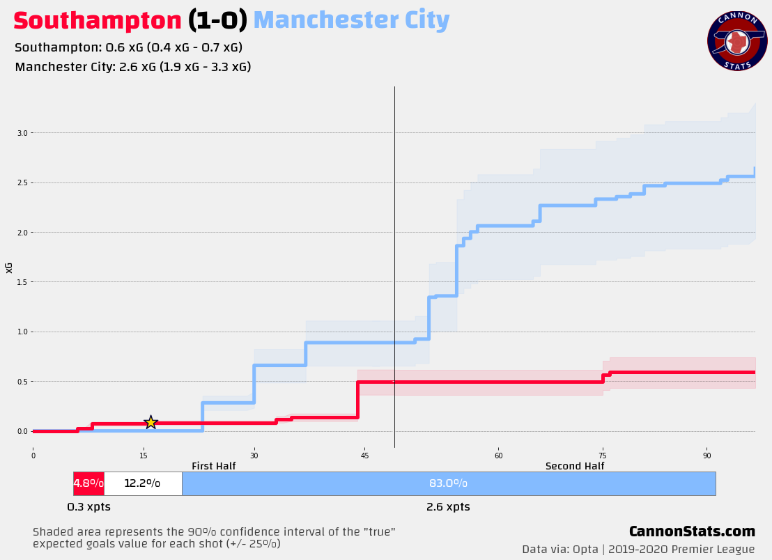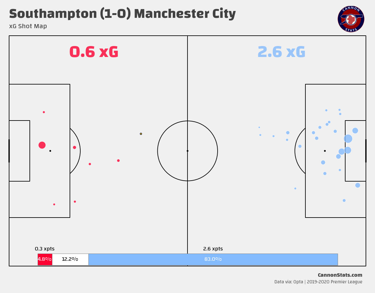 If we want to piggyback off of something similar to the video here is a good real-world example from the Premier League from 2020, in July Southampton beat Manchester City 1-0 from an early goal and were battered on expected goals. The aggregate xG scoreline here was Southampton 0.6 to 2.6 for Manchester City.