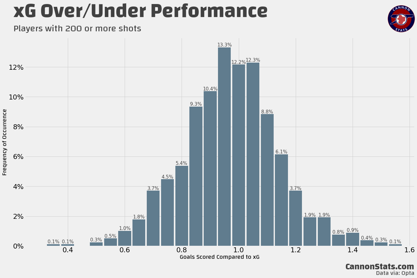 For the players that have taken 200+ shots in my shots database for the big five Leagues the distribution looks like this: